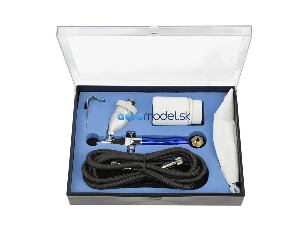 Balenie obsahuje pištoľ s dávkovacou nádobou, držiak pištole, hadicu so spojkou, fľašu so 100 g korundového abrazíva a ochranný štít.