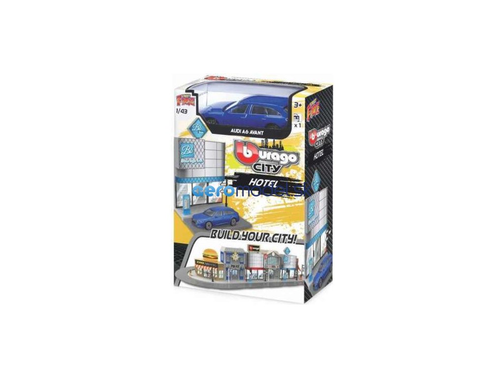 Herní set Bburago 18-31503 City - hotel s autíčkem Audi A6 Avant v měřítku 1:43 ( přibližně 10 cm velké ) pro malé milovníky aut. Set umožní malým řidičům si hrát, že jsou na dovolené. Balení obsahuje plastovou maketu hotelu, autíčko.