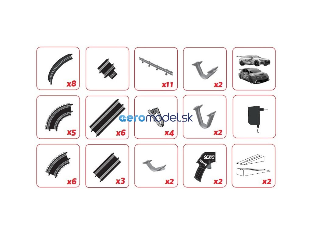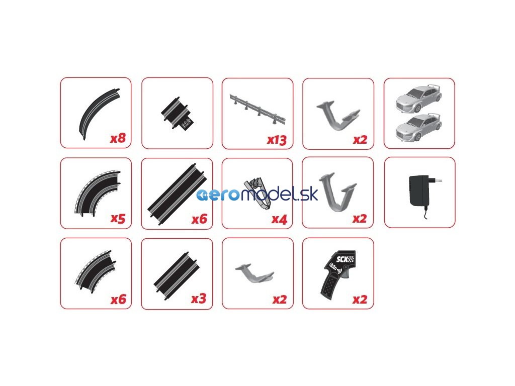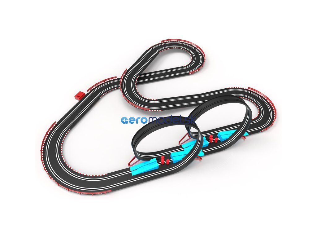 Balení obsahuje traťové díly, most, svodidla, dvojitý looping, 2x skokánek, 2x dráhové autíčko, 2x ovladač a napájecí zdroj.