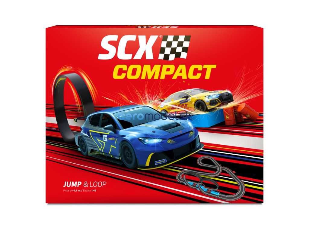 Autodráha SCX Compact Jump & Loop v měřítku 1:43 - analogová elektrická autodráha s rovinkami, zatáčkami, mostem, svodidly, barevnými obrubníky, dvojitým loopingem a skokánky. Dva bezdrátové ovladače, dvě detailní dráhová autíčka se světly, Cupra E-Racer Tambay a Porsche 911 GT3. Plocha pro rozložení základní varianty: 148 x 82 cm. Délka tratě: 6,6 m. Složení tratě je velmi snadné, jednotlivé traťové díly zacvaknete do sebe, připojíte ovladače a můžete začít závodit.