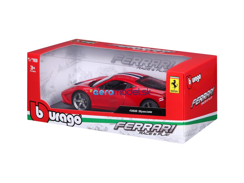 Kovový model auta Bburago 18-16002 Ferrari 458 Speciale 1:18 červený, nielen pre zberateľov. Má otváracie dvere a kapotu, odpružené nápravy, otáčanie volantu je plne funkčné. Farba modelu je červená
