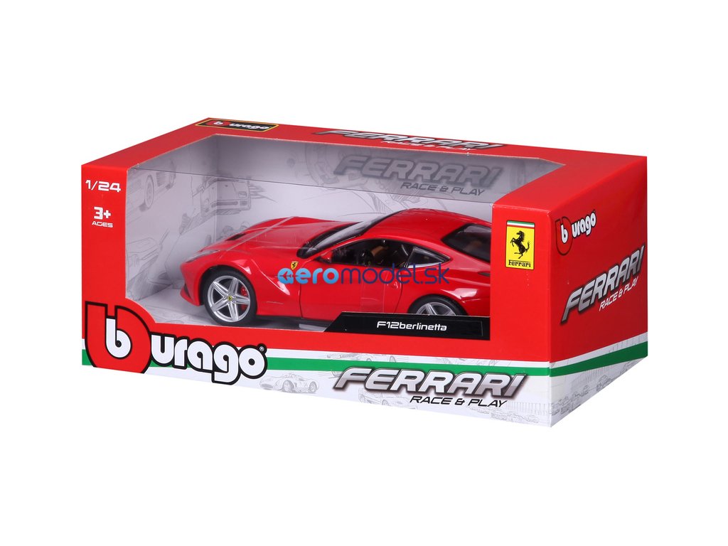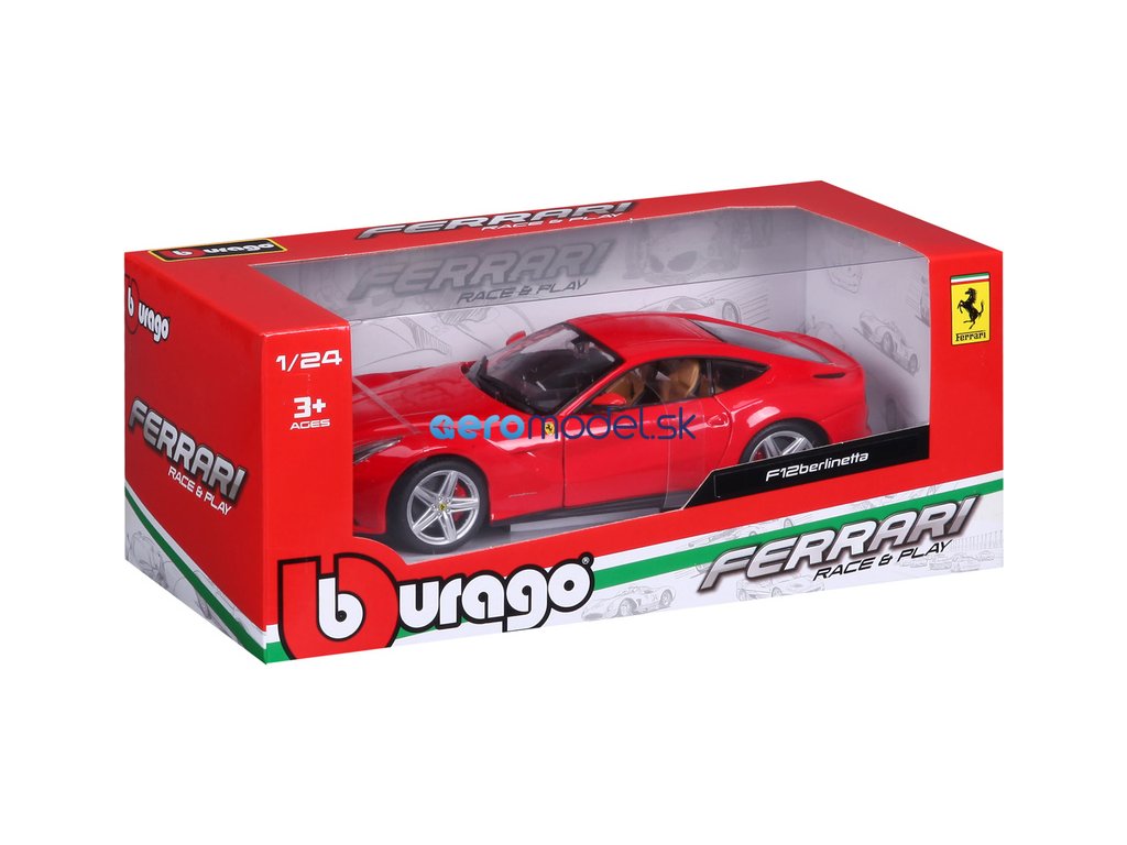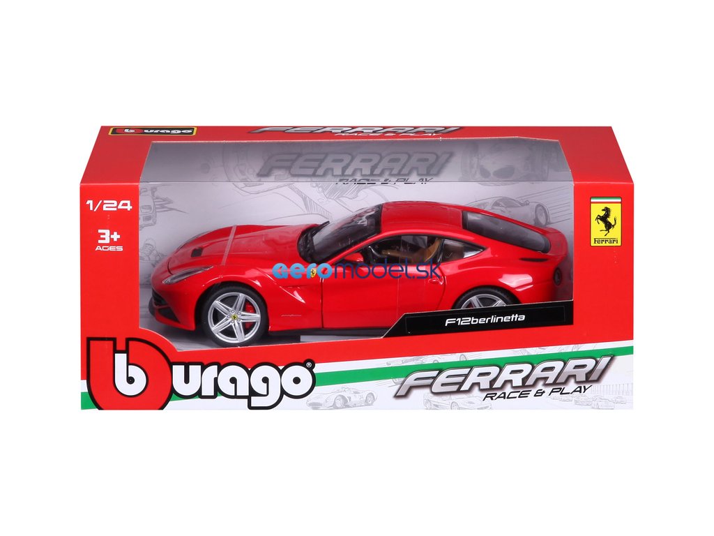 Kovový model auta 1:24 Bburago 18-26007 F12 Berlinetta je určený nielen pre zberateľov. Má otváracie dvere a kapotu. Farba modelu je červená. Dĺžka modelu je približne 19 cm.