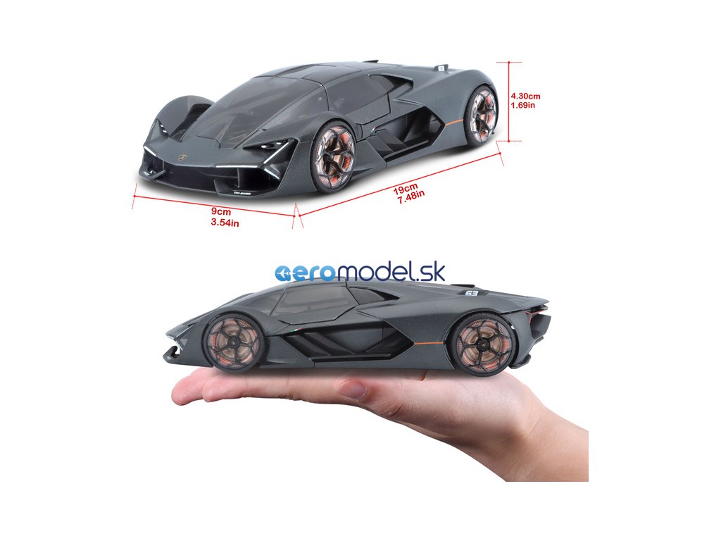 Kovový model auta Bburago 18-21094 Plus Lamborghini Terzo Millennio v mierke 1:24 je určený nielen pre zberateľov. Má otváracie dvere a kapotu, otáčanie volantu je plne funkčné. Farba modelu je sivá.