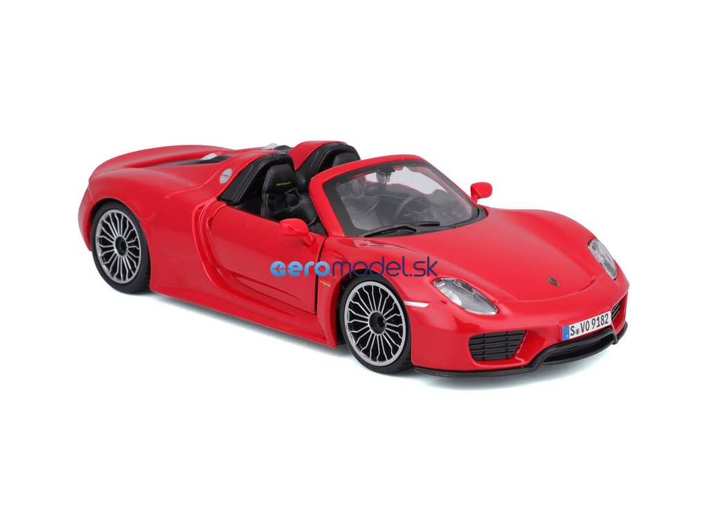 Kovový model auta 1:24 Bburago Plus 18-21076 Porsche 918 Spyder nielen pre zberateľov. Má otváracie dvere a kapotu, otáčanie kolies je funkčné. Farba modelu je červená.