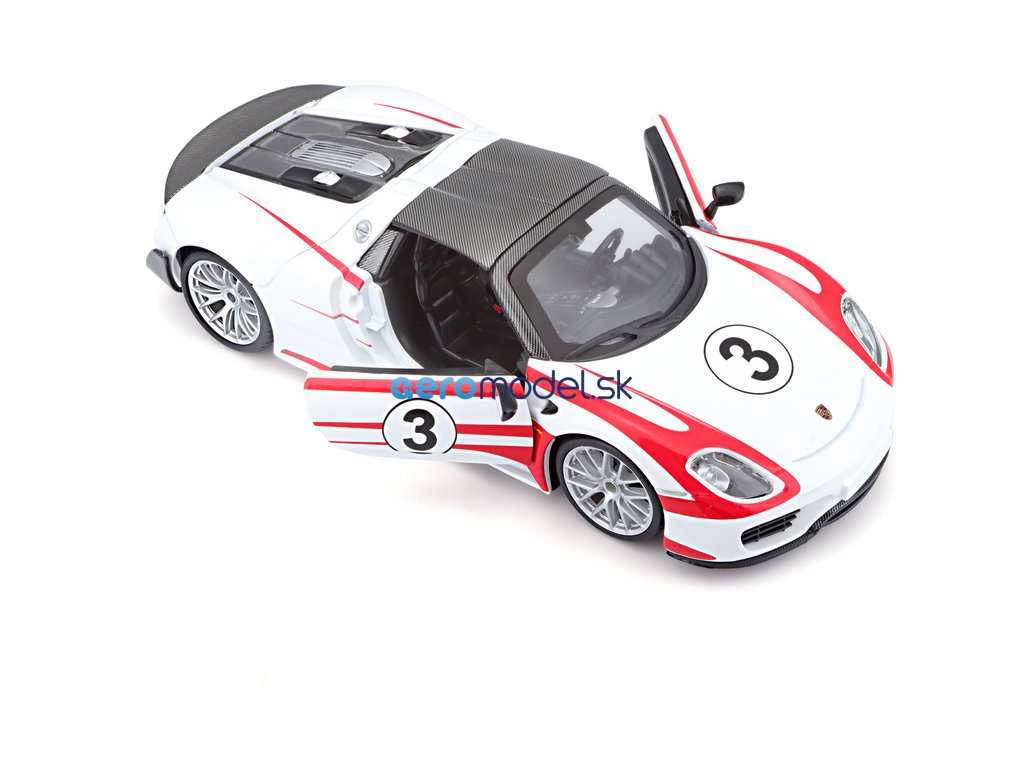 Kovový model auta 1:24 Bburago 18-28009 Race Porsche 918 Weissach nielen pre zberateľov. Má otváracie dvere, otáčanie volantu je plne funkčné. Farba modelu je biela.