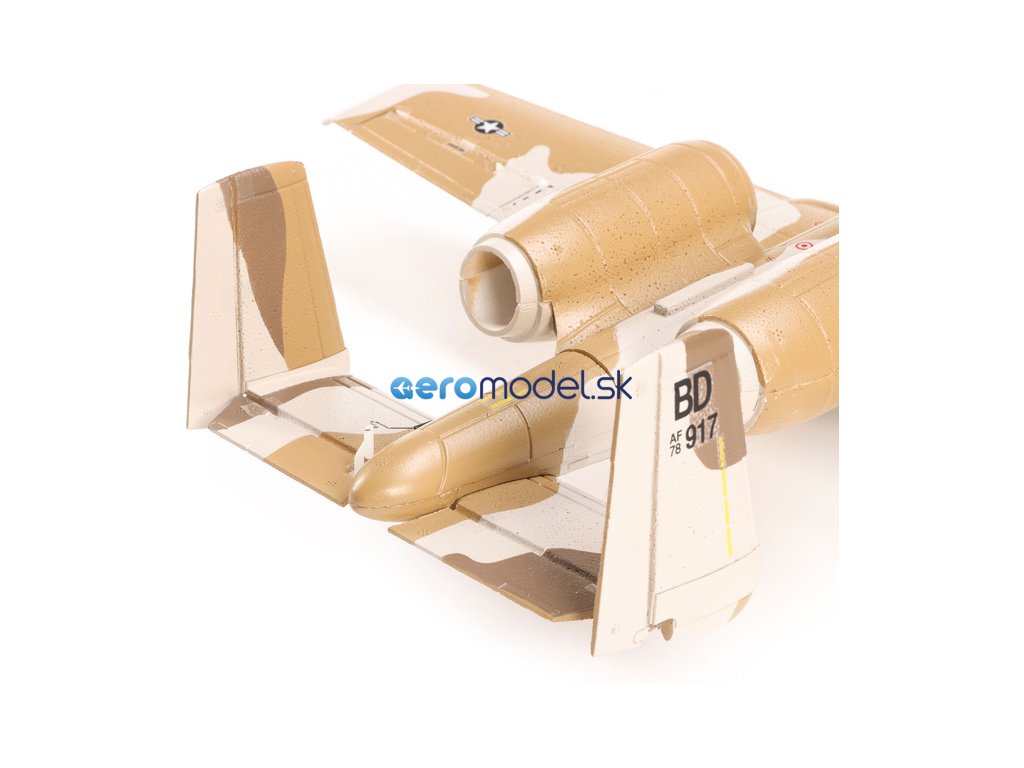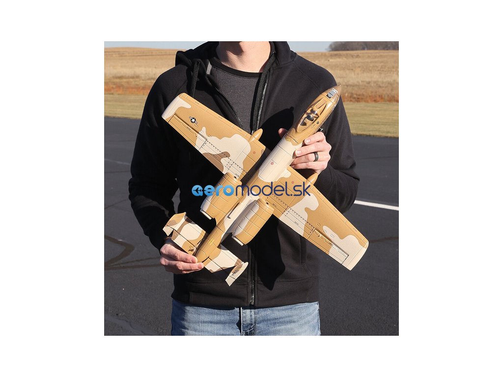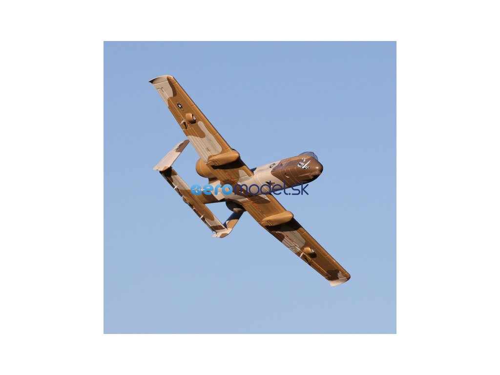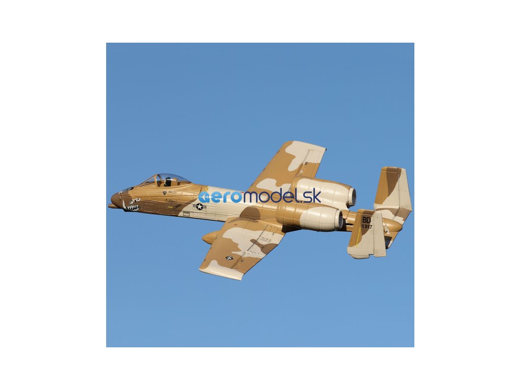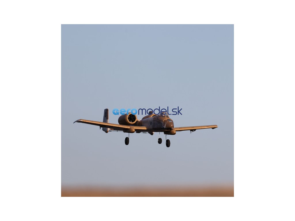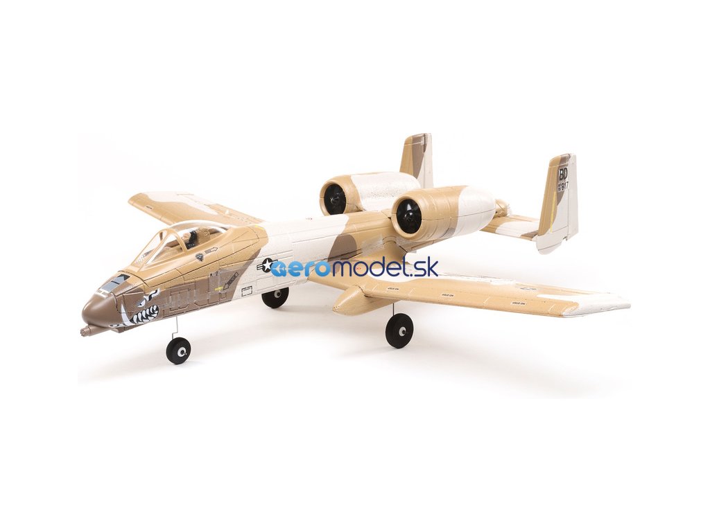 Vzhľad makety s mnohými detailmi spolu s vybavením kabíny je úplne autentický. Priehľadný plastový kokpit s hlavou pilota, model guľometu, plátenný poťah, nápisy, imatrikulácia. E-flite A-10 má úžasné výkony pohonnej jednotky, štartuje a pristáva na riadenom podvozku s predným kolesom alebo podvozok odmontujte a štartujte ručne, pristávajte na tráve. Všetky funkcie sú ovládané proporcionálne a kormidlo má ovládané obe smerovky.