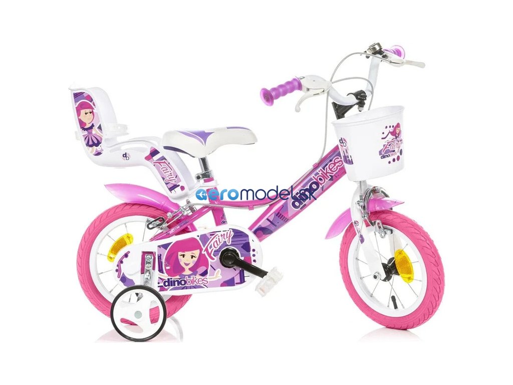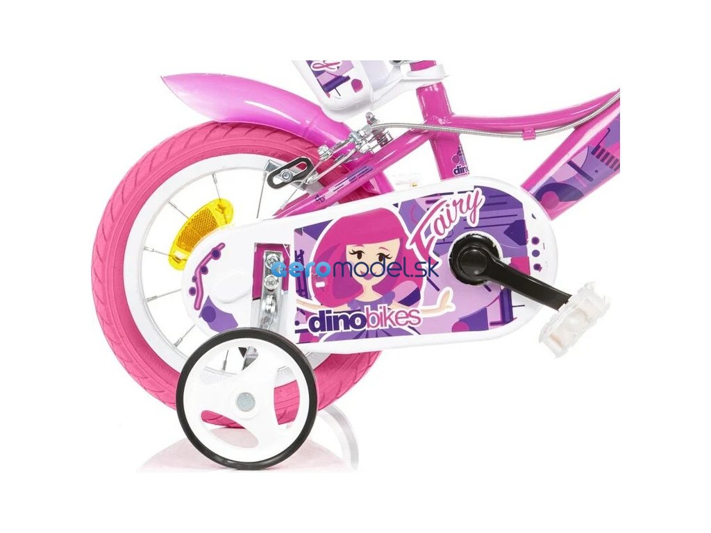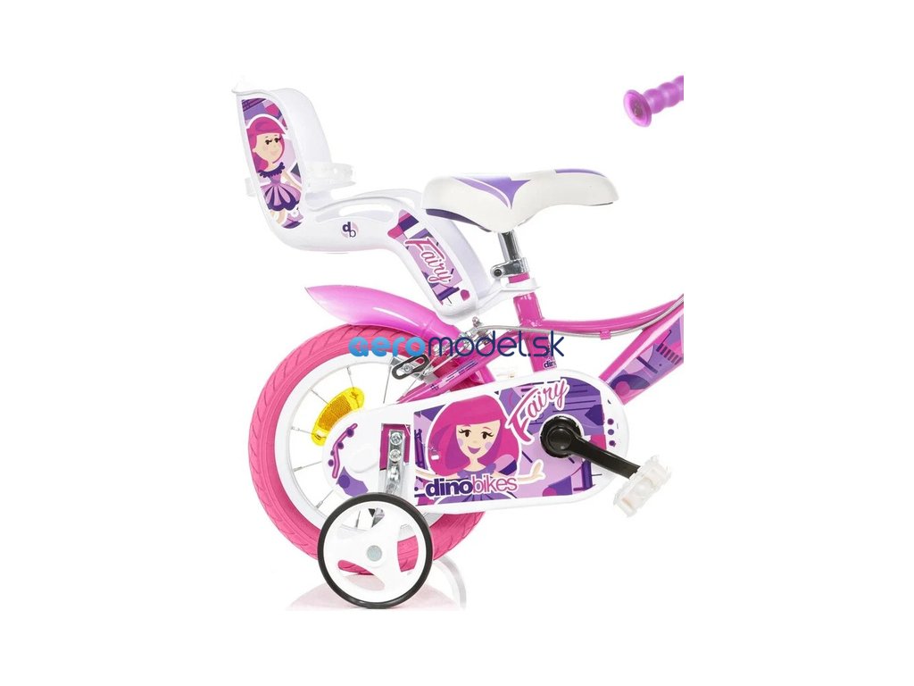 Dětské kolo DINO Bikes - 12" s motivem Fairy růžové, sedačkou pro panenku a košíkem, je perfektní kolo pro malé cyklistky. Vzduchem plněné pneumatiky s kovovými ráfky, přídavná kolečka, volnoběžný převod, čelisťové brzdy na obě kola.
