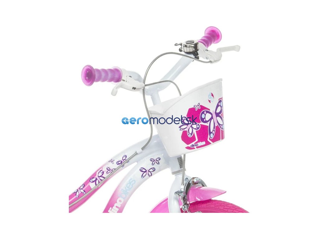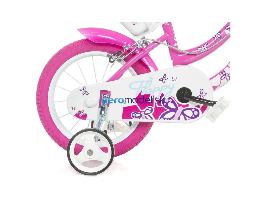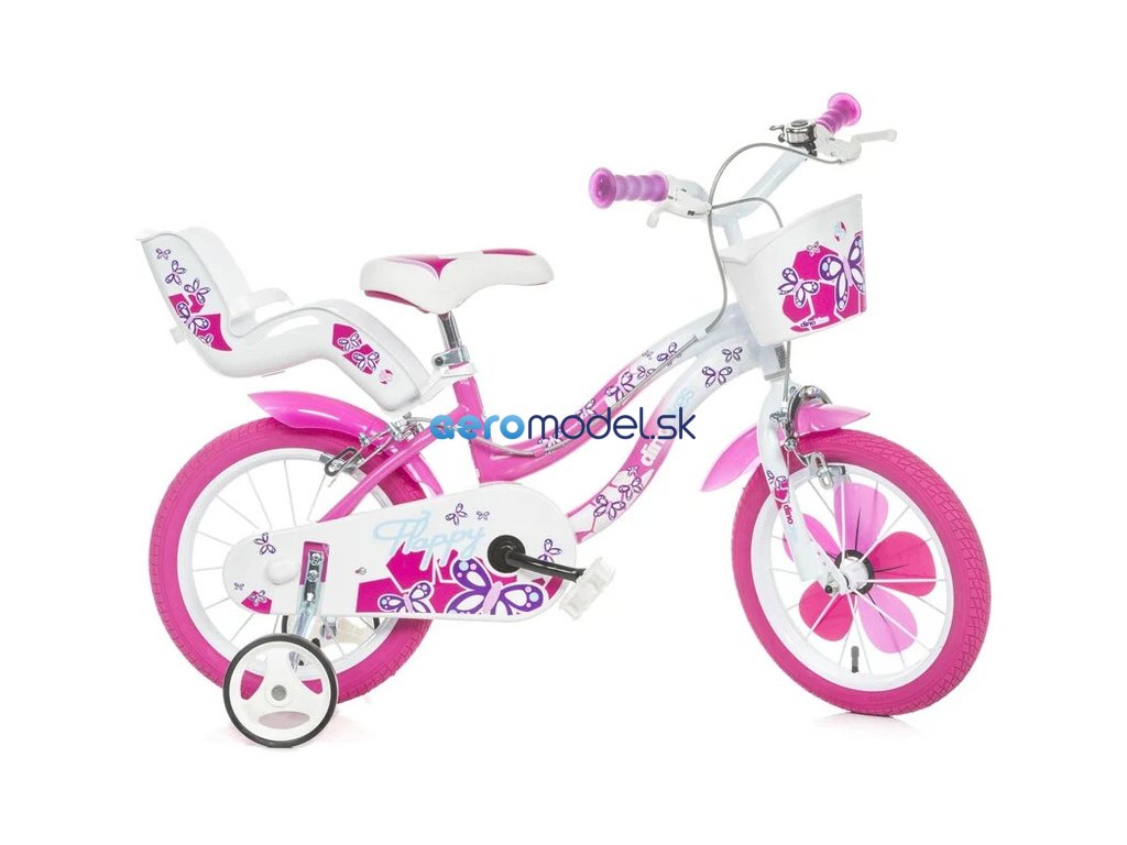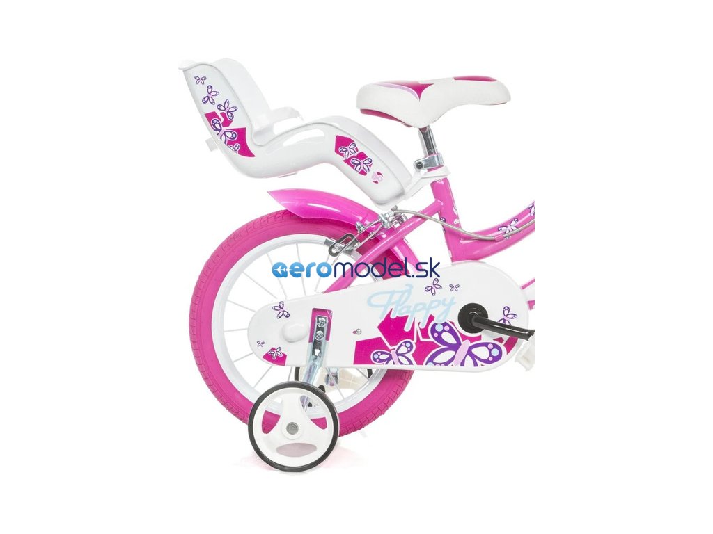 Dětské kolo DINO Bikes - 14" Flappy růžové, sedačkou pro panenku a košíkem, je perfektní kolo pro malé cyklistky. Vzduchem plněné pneumatiky s kovovými ráfky, přídavná kolečka, volnoběžný převod, čelisťové brzdy na obě kola. Zvonek. Doporučený věk a výška dítěte: 3-5 let, 95-127 cm.
