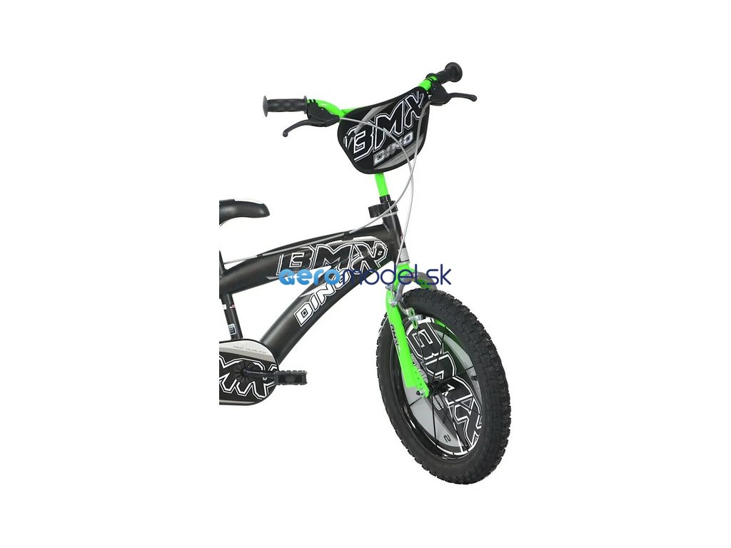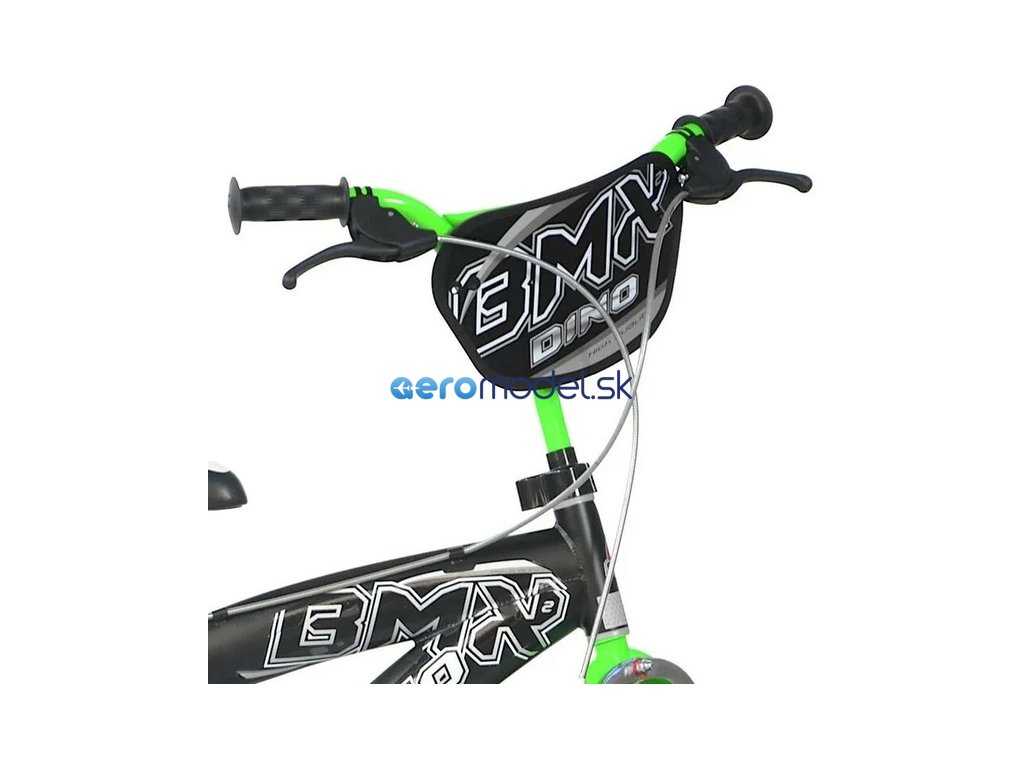 Dětské kolo DINO Bikes - 16" BMX černé/zelené, kolo pro malé rychlíky. Kvalitní, vzduchem plněné pneumatiky s drátovým výpletem ráfků, volnoběžný převod, čelisťové brzdy na obě kola.