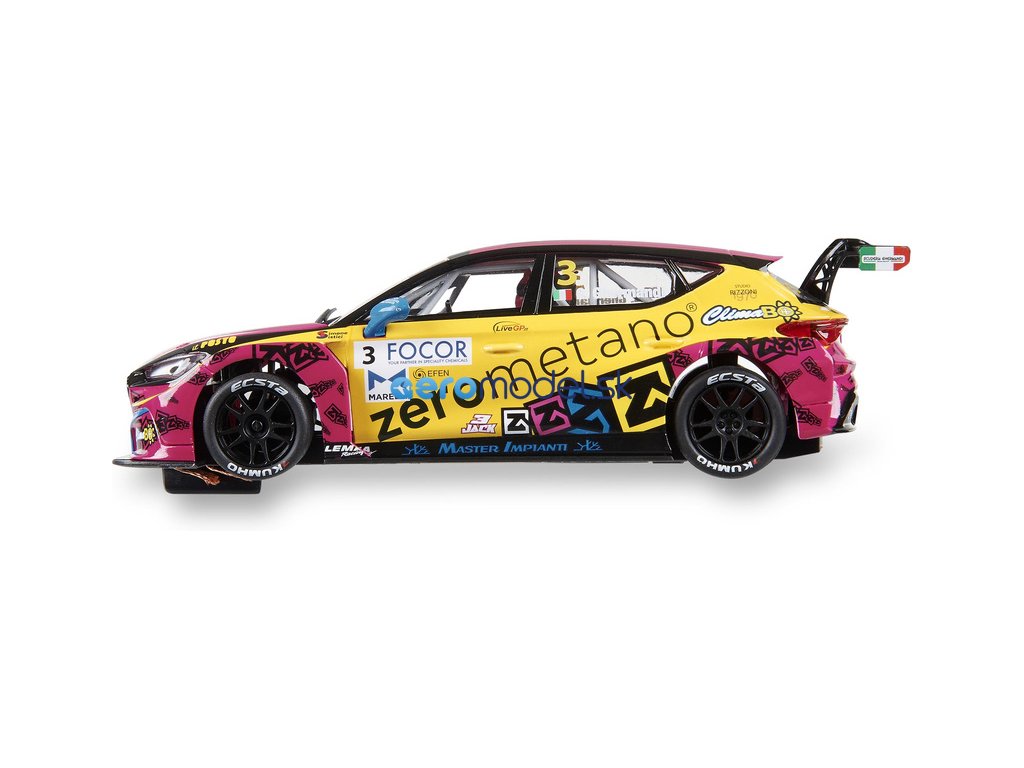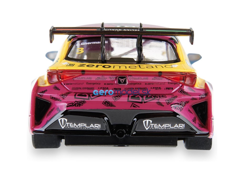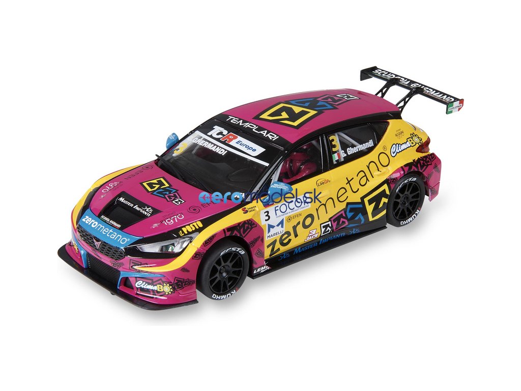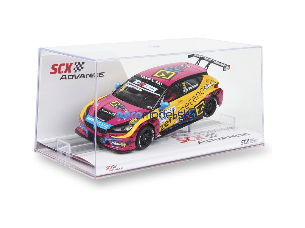 Dráhové autíčko SCX Advance Cupra León Competición Zero Metano v měřítku 1:32, verze 2.0, pro digitální autodráhy SCX Advance. Autíčko je vybaveno LED osvětlením. Na podvozku se nachází přepínač digital / analog - autíčko lze tedy používat na digitální autodráze SCX Advance i na analogové autodráze SCX Classic.