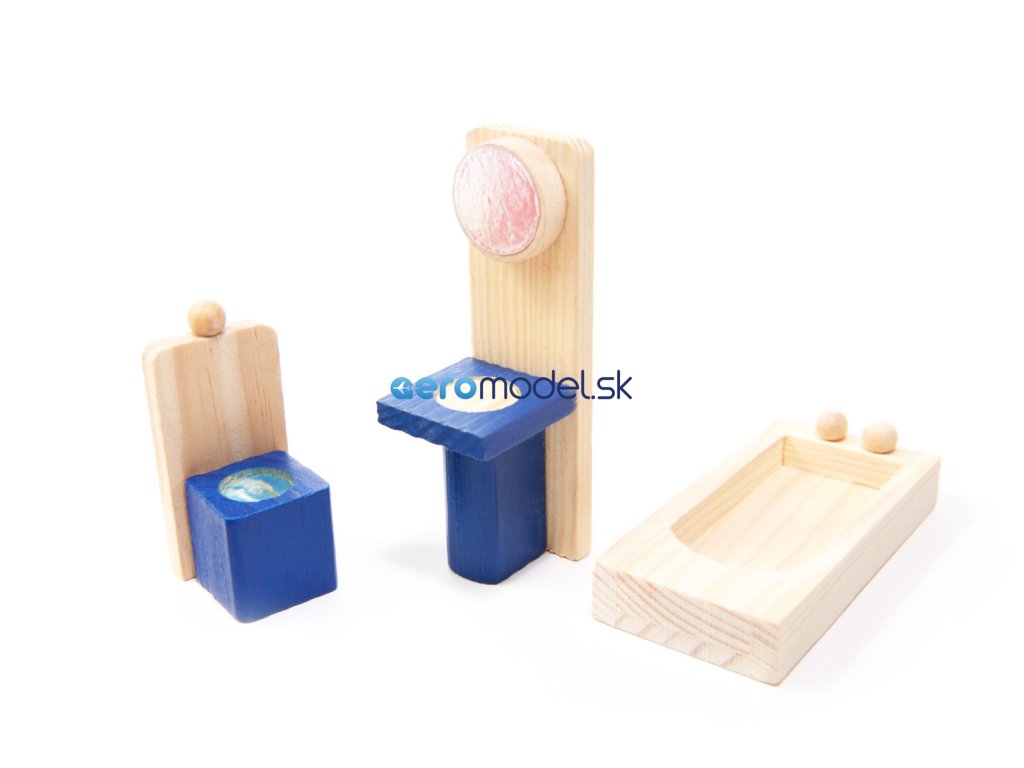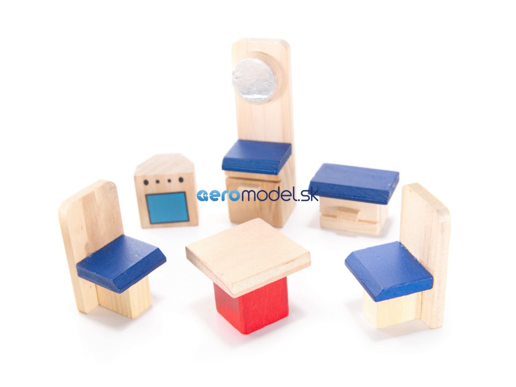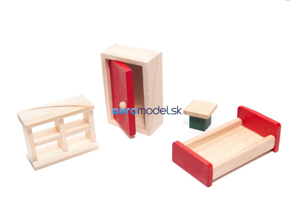 Medzi nábytkom nájdete: • Krásnu šatníkovú skriňu s otváracími dverami, ktorá sa skvele hodí aj na uskladnenie cenných drobností vášho dieťaťa. •Posteľ • Komodu • Poličku • Nočný stolík • 2 stoličky • Stôl • Sporák • Vaňu • Umývadlo • WC so zrkadlom zo striebornej samolepiacej fólie.