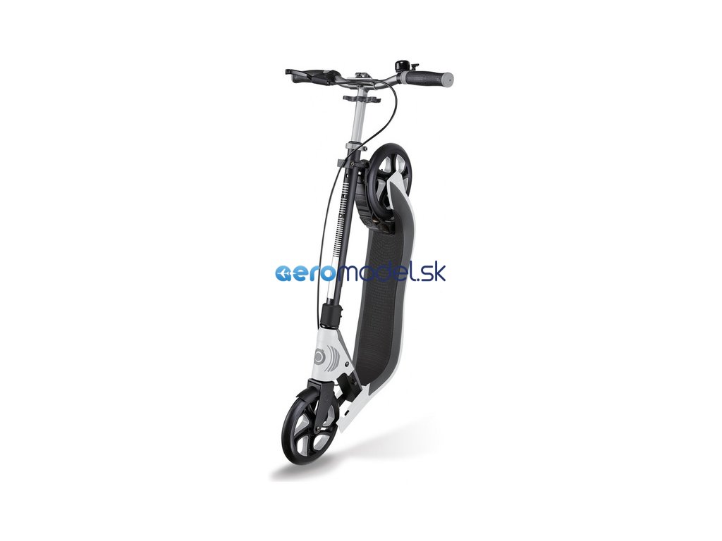 Koloběžka je vybavena unikátním skládacím systémem. Zatažením za očko na řídítkách se odjistí pojistka a řídítka můžete snadno složit až k desce, kde je pomocí očka zajistíte. Koloběžka se tak dostane do velmi kompaktního tvaru, složenou ji můžete snadno přenášet, nebo vést za sebou.