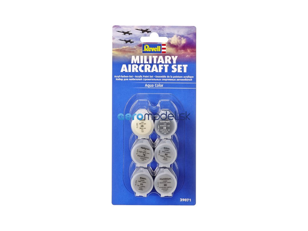 Sada šiestich akrylových farieb Revell 39071 Aqua Color, ktoré sa najčastejšie používajú na vojenské lietadlá. Každá farba má objem 5 ml!