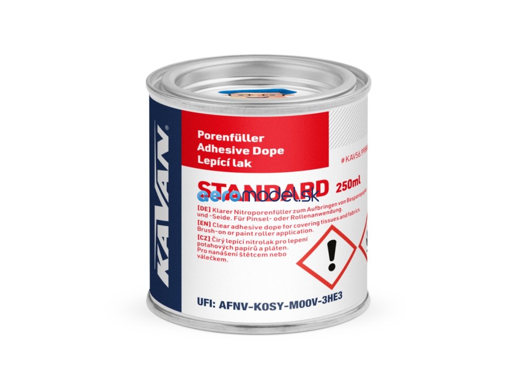 Použití: Zpravidla se nanáší neředěný (je-li třeba, použijte KAVAN Ředidlo STANDARD); na kostru nanášejte měkkým plochým štětcem nebo válečkem. Ihned přitiskněte a přihlaďte potahový papír nebo plátno; případné vzduchové bubliny odstraňte štětcem nebo válečkem. Nechejte vyschnout nejméně 24 hodin a přebruste jemným brusným papírem 600–1000. Při použití na modelu se spalovacím motorem je nutno nanést vrchní krycí vrstvu odolnou vůči palivu (např. KAV56.9990 KAVAN krycí lak POLY, 5MA4401 RC Color bezbarvý lak ve spreji).