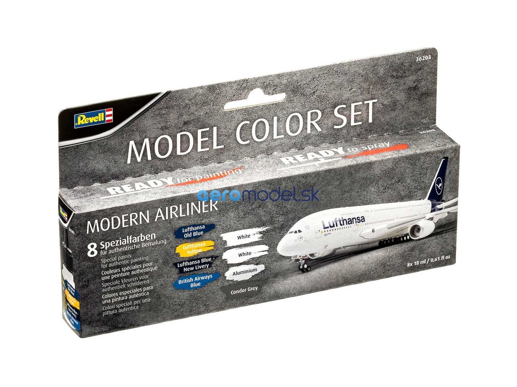 Sada osmi akrylových barev pro modeláře Revell nejčastěji používaných na moderních letadlech. Barvy jsou po 17 ml.