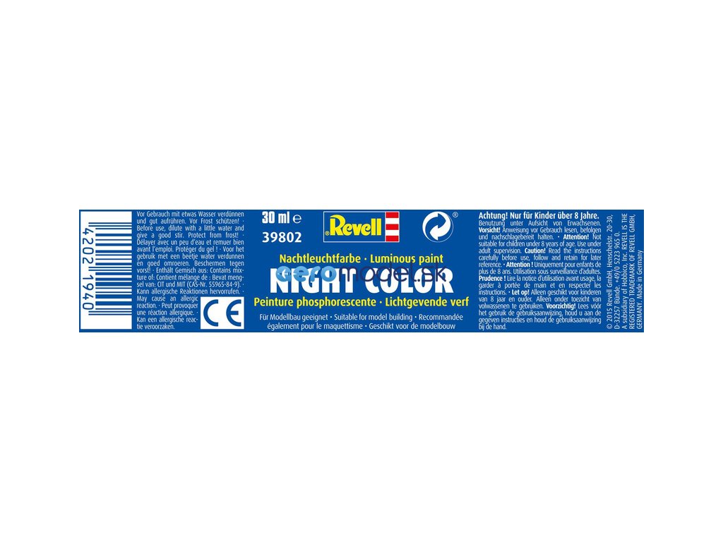 Revell Night Color 39802 je fosforeskujúca farba, ktorá svieti v tme. Ideálna pre svetelné efekty a rybárov (na označenie nástrah pre nočný rybolov).