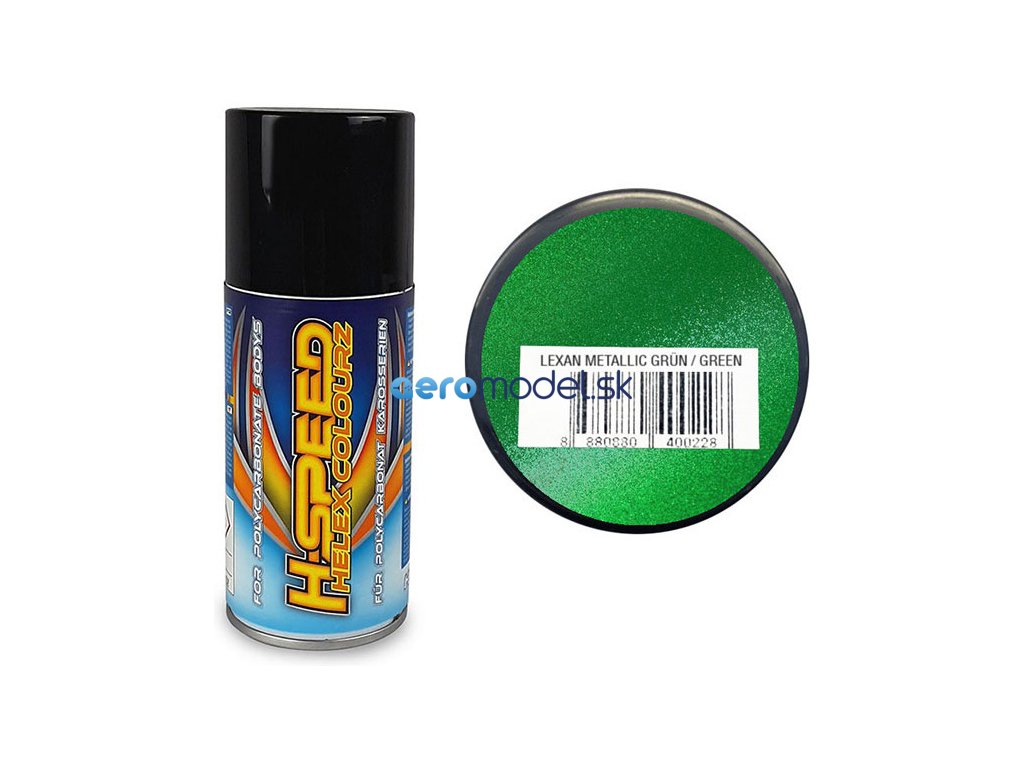 H-Speed metalická zelená akrylová barva ve spreji je vhodná pro širokou škálu materiálů (plasty kromě nylonu, kovy, dřevo, sklo, keramika, papír, EPP, EPS). Barvy nezpůsobují korozi lexanu! Akrylové barvy rychle schnou, výborně kryjí a jsou odolné proti poškrábání.