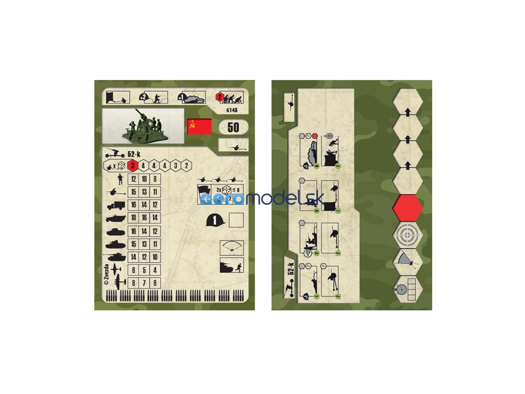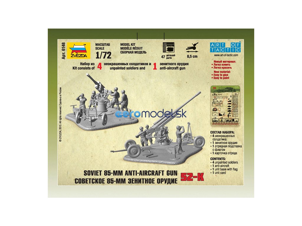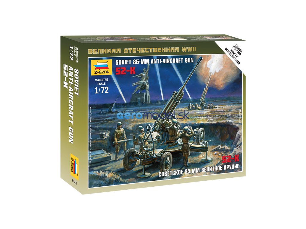 Plastikový model Zvezda 6148 - sovětské 85 mm protiletadlové dělo 52-K v měřítku 1:72. Stavebnice obsahuje 47 dílků, délka 85 mm, obtížnost 3. Ideální pro doplnění plastikových modelů či diorámat.