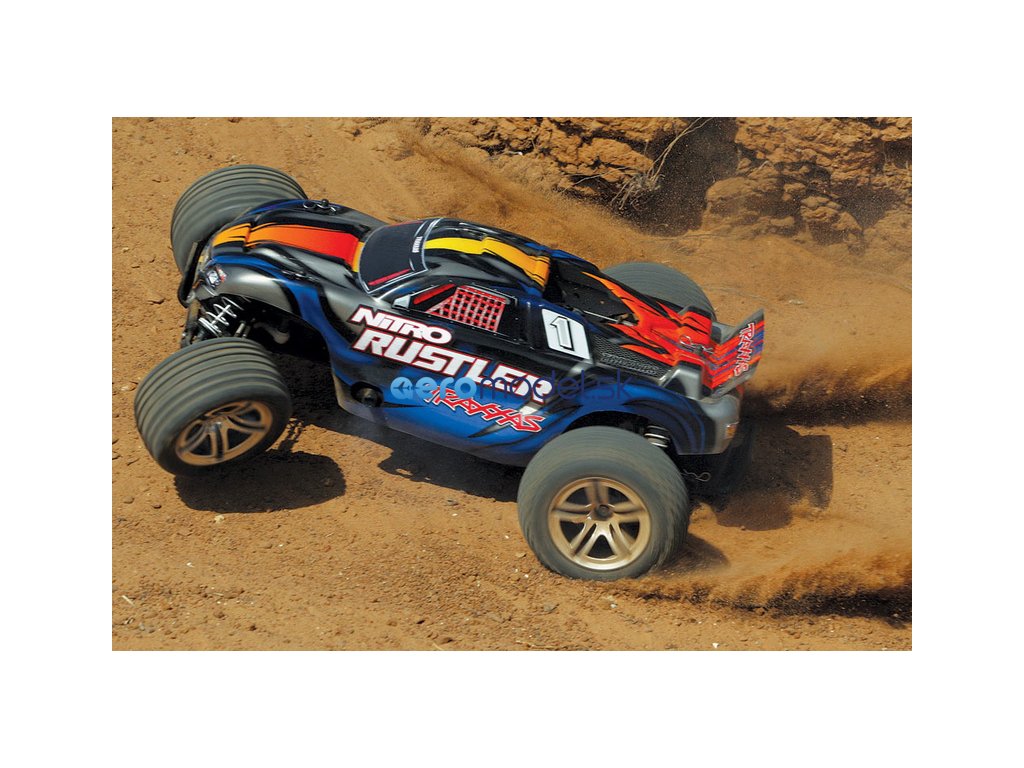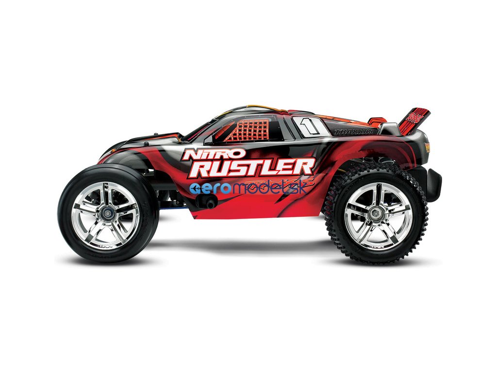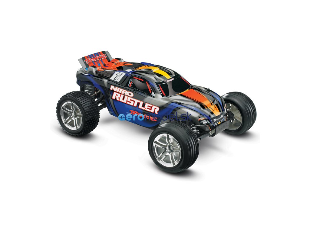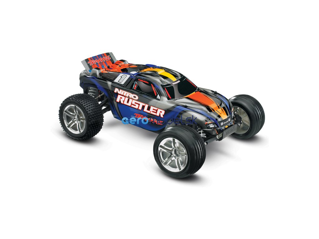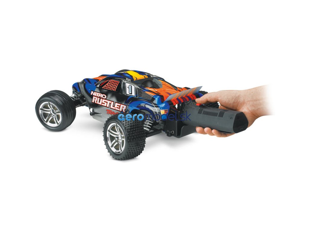 RC model auta Traxxas Rustler Nitro je výkonná 2WD Truggy. Rustler je osazen osvědčeným závodním motorem TRX 2.5 a díky tomu dokáže zvládnout rychlost až 80 km/hod! Motor TRX 2.5 udělí autu brutální zrychlení, které oceníte při výjezdu ze zatáčky, na technických tratích stejně jako na dlouhých rovinkách. Zcela nový design karosérie podtrhuje jeho ladné linie se zdařilou dravou grafikou, nízko položené těžiště dává RC autu skvělé jízdní vlastnosti.