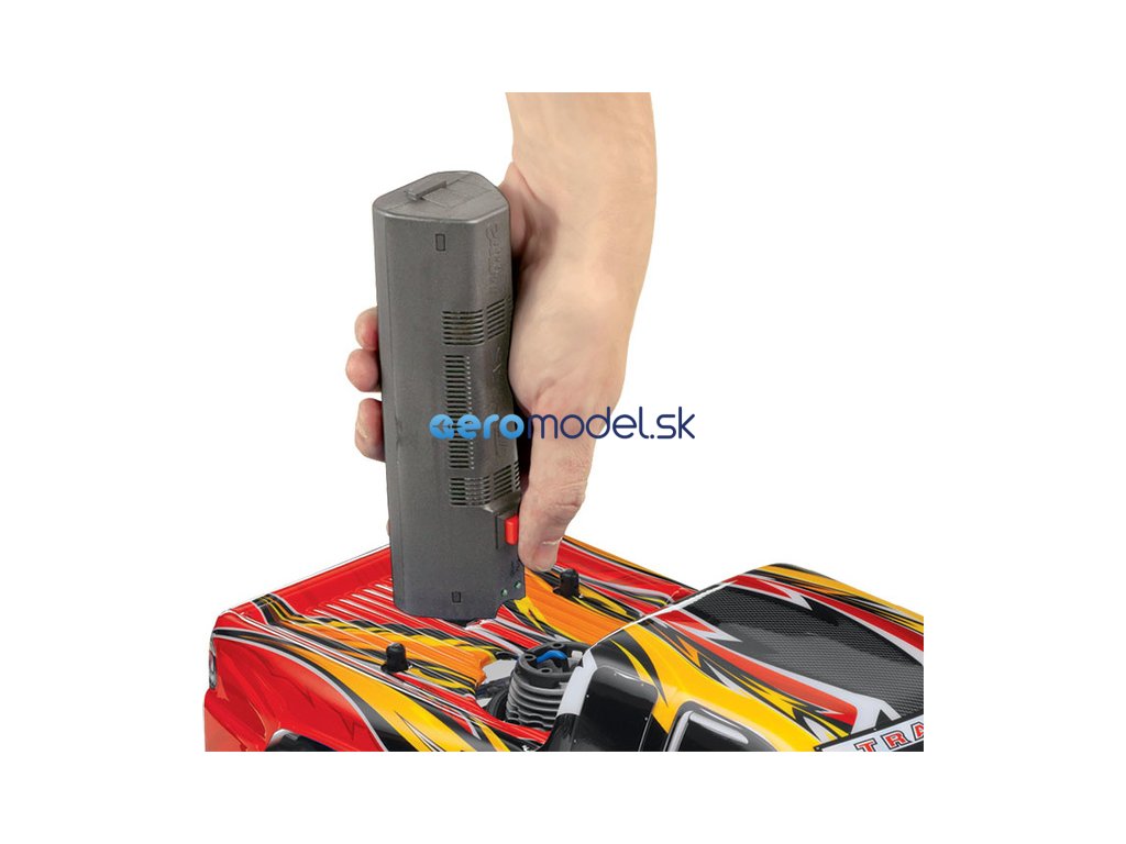 Balení obsahuje NiMH akumulátor a nabíječ pro elektrický startér. Tento nabíječ je na stejnosměrné napětí 12V s auto-zástrčkou. Pro napájení nabíječe ze sítě 230V je nutné dokoupit - Traxxas síťový zdroj.