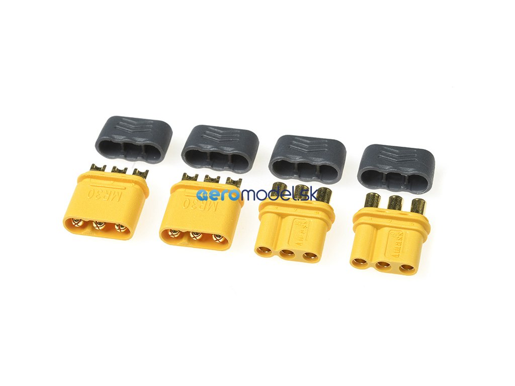 Pozlátené konektory MR-30 sú ideálnou voľbou všade tam, kde je potrebné často odpojovať konektor serva. Konektor má polohovateľnú drážku na správne pripojenie anténnej trubice. Malé, odolné a spoľahlivé konektory majú plastový kryt, ktorý sa na konektor nacvakne po spájkovaní káblov. Súčasťou balenia sú 2 páry.