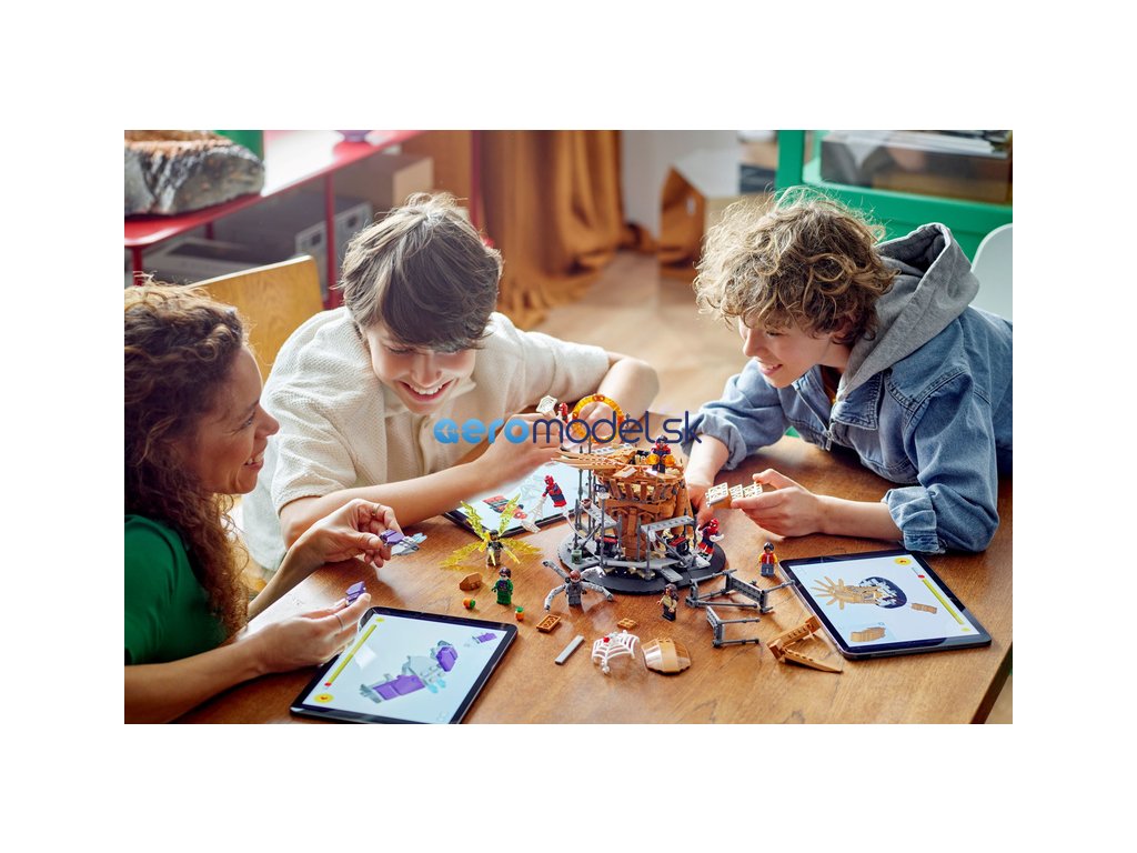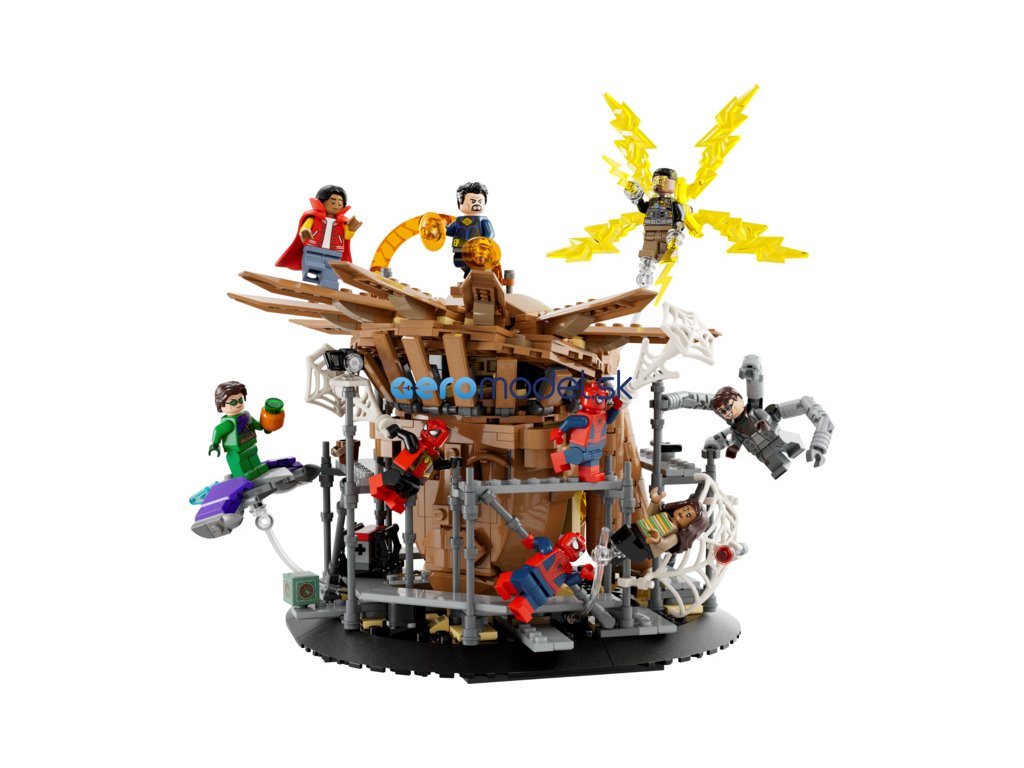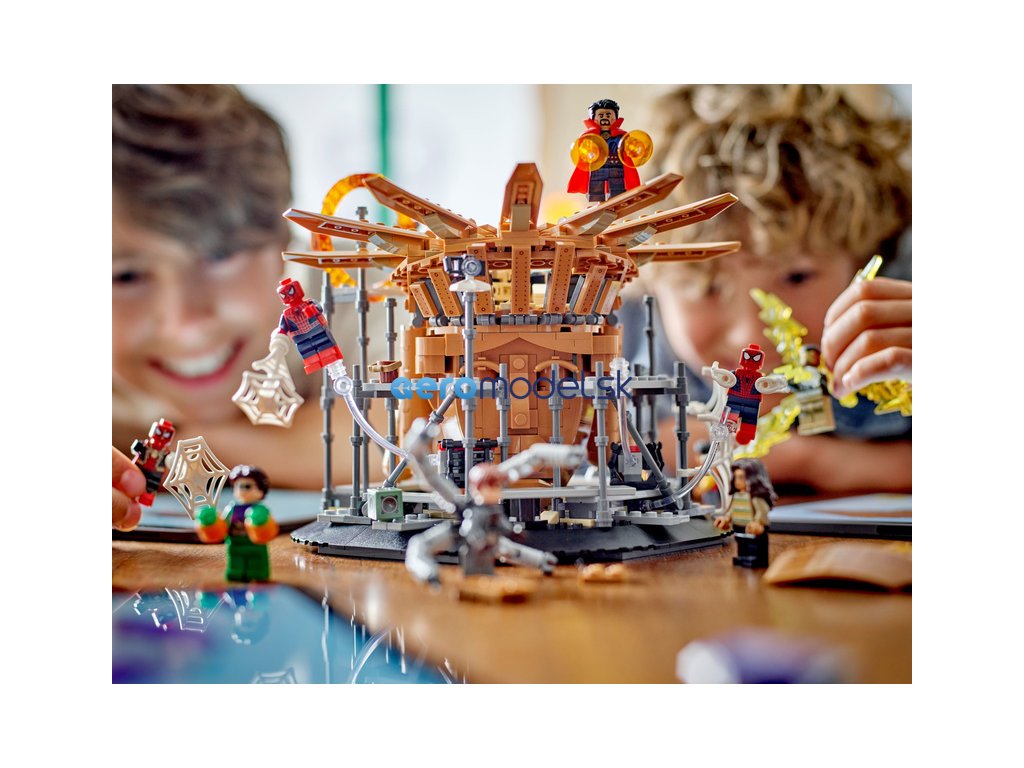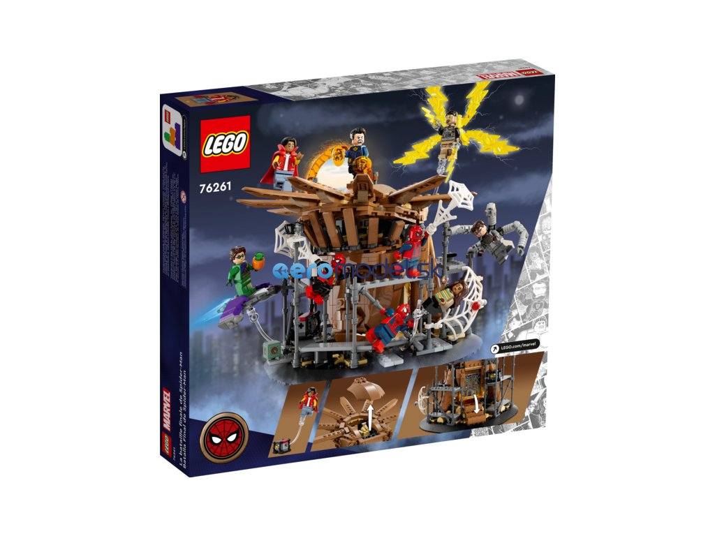 Tato 360° stavebnice obsahuje úžasnou kombinaci minifigurek LEGO Marvel včetně 3 verzí Spider-Mana: přátelského Spider-Mana ze sousedství (Tobey Maguire), Úžasného Spider-Mana (Andrew Garfield) a Spider-Mana (Tom Holland). Další minifigurky jsou Electro, Doktor Strange, Zelený goblin, Ned, MJ a Doc Ock. Součástí je mnoho funkcí pro maximální možnosti hraní a vystavení, jako jsou 3 podstavce minifigurek pro akci ve vzduchu, sundávací střecha, která odhalí Sandmanovu ruku, vyklápěcí zadní vstup do portálu a jemnou pavučinu k omotání minifigurek. Stavitelé si také mohou užít porci digitální zábavy navíc pomocí zábavné a intuitivní aplikace LEGO Builder, kde mohou model přibližovat, otáčet ve 3D a sledovat svůj pokrok.