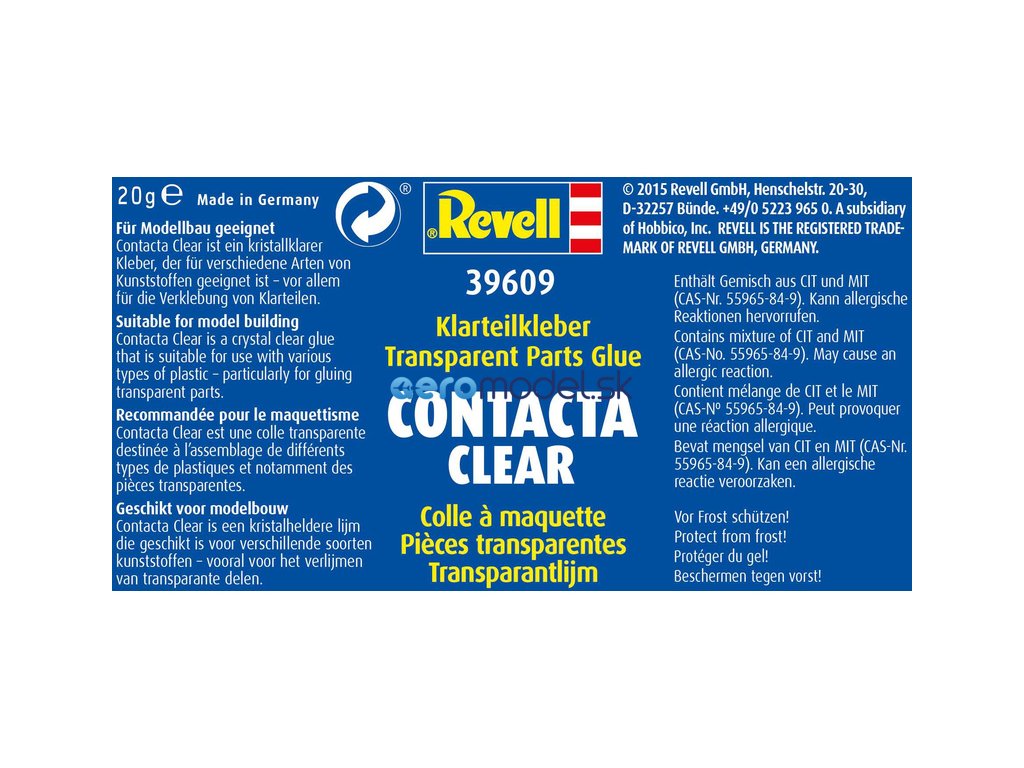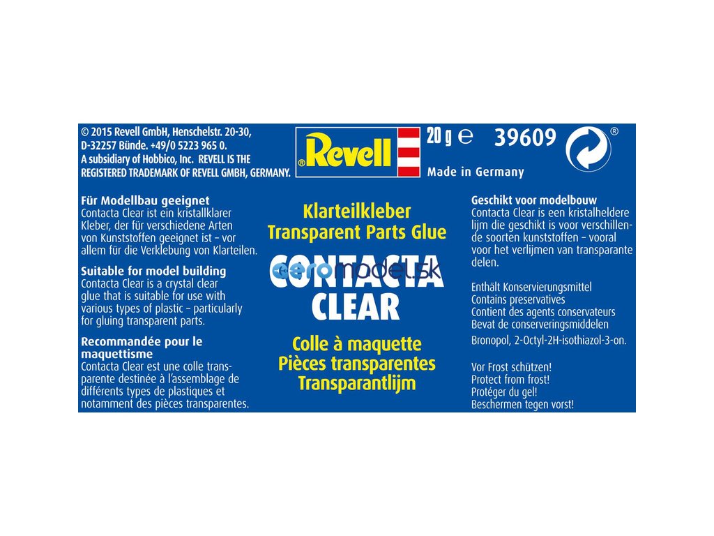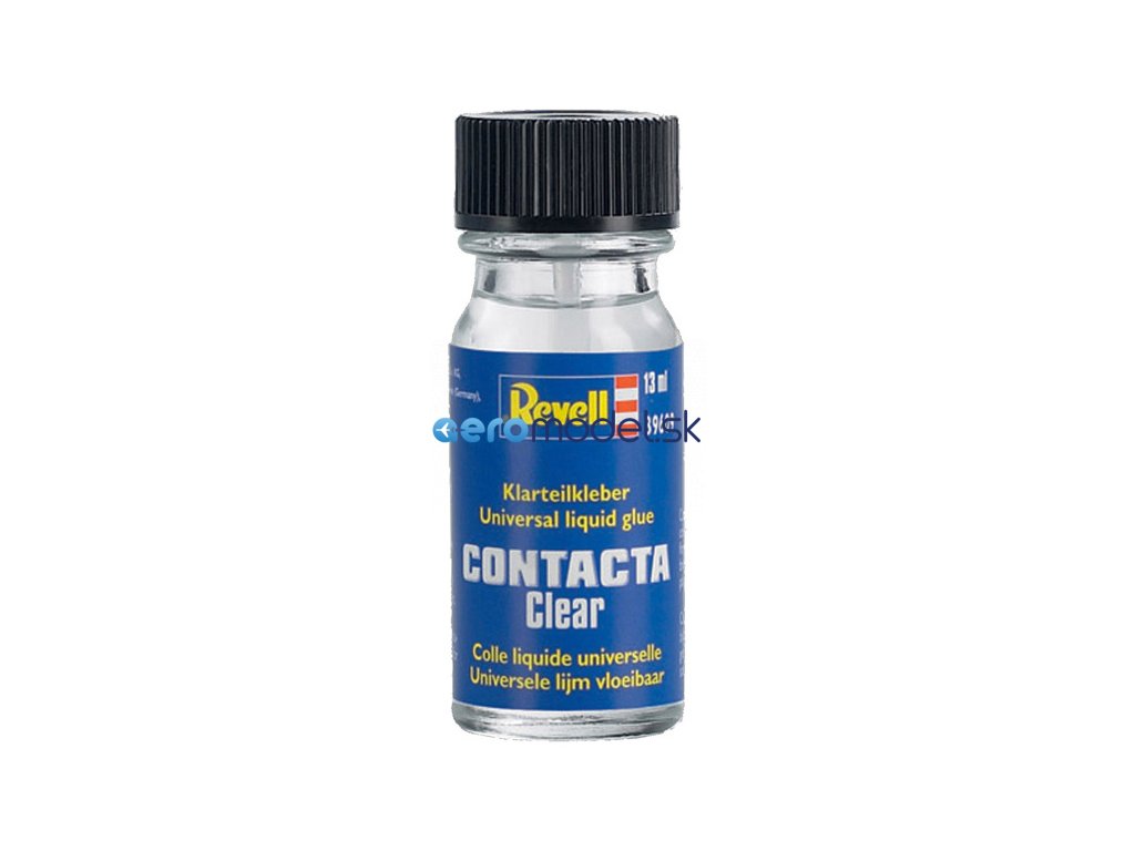Revell Contacta Clear 39609 je špeciálne lepidlo na lepenie čírych plastov na plastové modely. Po vytvrdnutí je úplne priehľadné, takže ho možno použiť najmä na lepenie okien alebo kabín. Pomocou štetca v uzávere fľaše sa ľahko nanáša tenká vrstva.