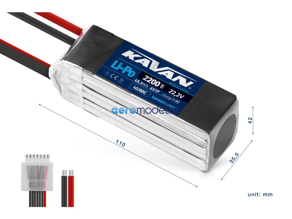 Akumulátory KAVAN řady 40/80C mají standardní vybíjecí proud 40C, špičkový až 80C a možnost rychlého nabíjení (1-2C). Jsou určeny pro náročnější aplikace v modelech letadel pro klasickou i 3D akrobacii, modelech poháněných dmychadlem a vrtulnících pro klasickou i 3D akrobacii. Vysoká proudová zatížitelnost zaručuje maximální využití výkonu motoru a dovoluje razantní styl létání při zachování velmi dobré dlouhodobé životnosti.