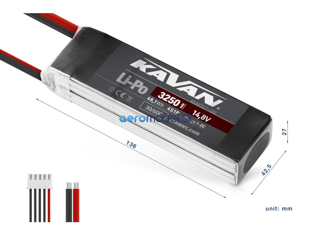 Lithiumpolymerové akumulátory KAVAN řady 30/60C s proudovou zatížitelností max. 30C jsou určeny pro běžné aplikace v rekreačních i sportovních modelech letadel pro klasickou i 3D akrobacii. Vysoká proudová zatížitelnost zaručuje maximální využití výkonu motoru a dovoluje i poměrně razantní styl létání při zachování velmi dobré dlouhodobé životnosti.