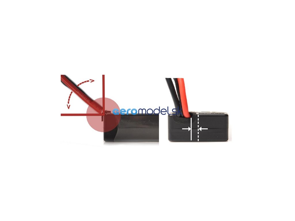 Gumová průchodka na výstupu kabelu ideálně chrání společně umístěné silikonového kabelu a balančního konektoru. Ta je opět mírně odsazena od středu, aby kabely nekolidovaly s sloupkem baterie a mohly být snadno vyvedeny z každého bateriového prostoru pod úhlem 0° - 90°.
