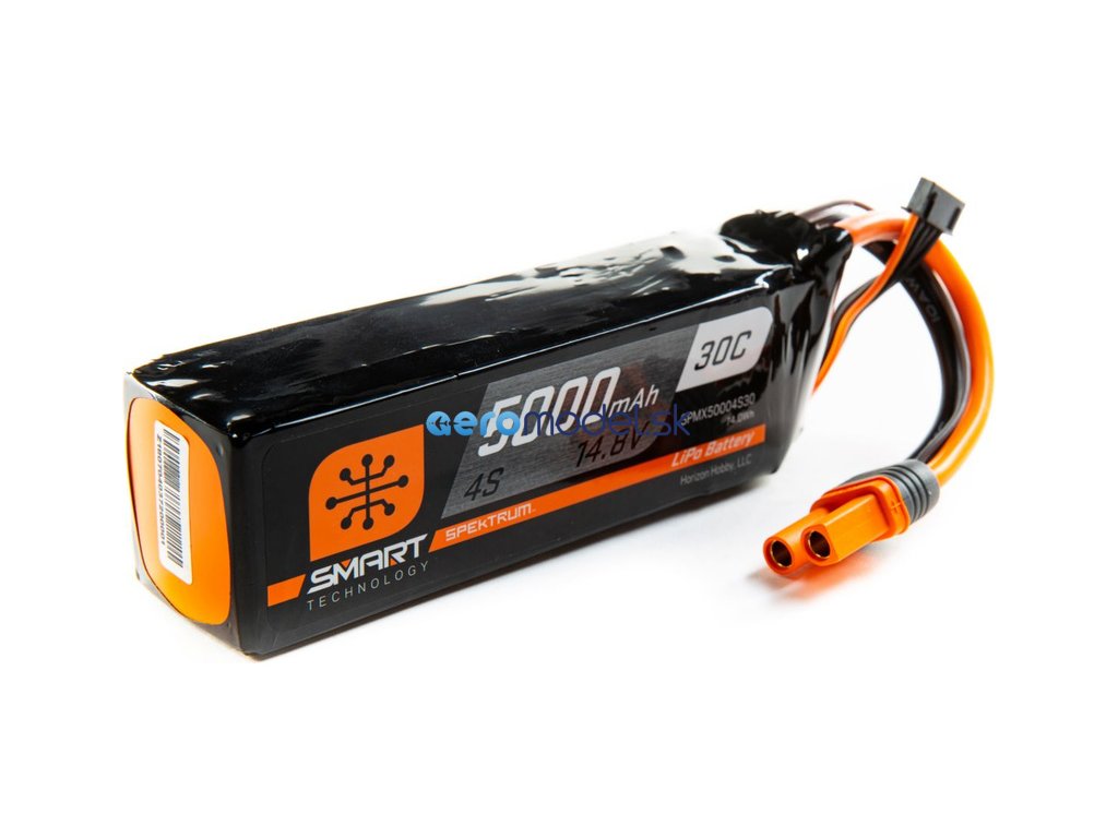 LiPo akumulátor Spektrum 14,8 V 5000 mAh 30C s technológiou Smart pre RC modely lietadiel. Technológia Smart uľahčuje používanie, rýchlejšie nabíjanie a predlžuje životnosť batérie. Konektor IC5, rozmery 142 x 43 x 37 mm.