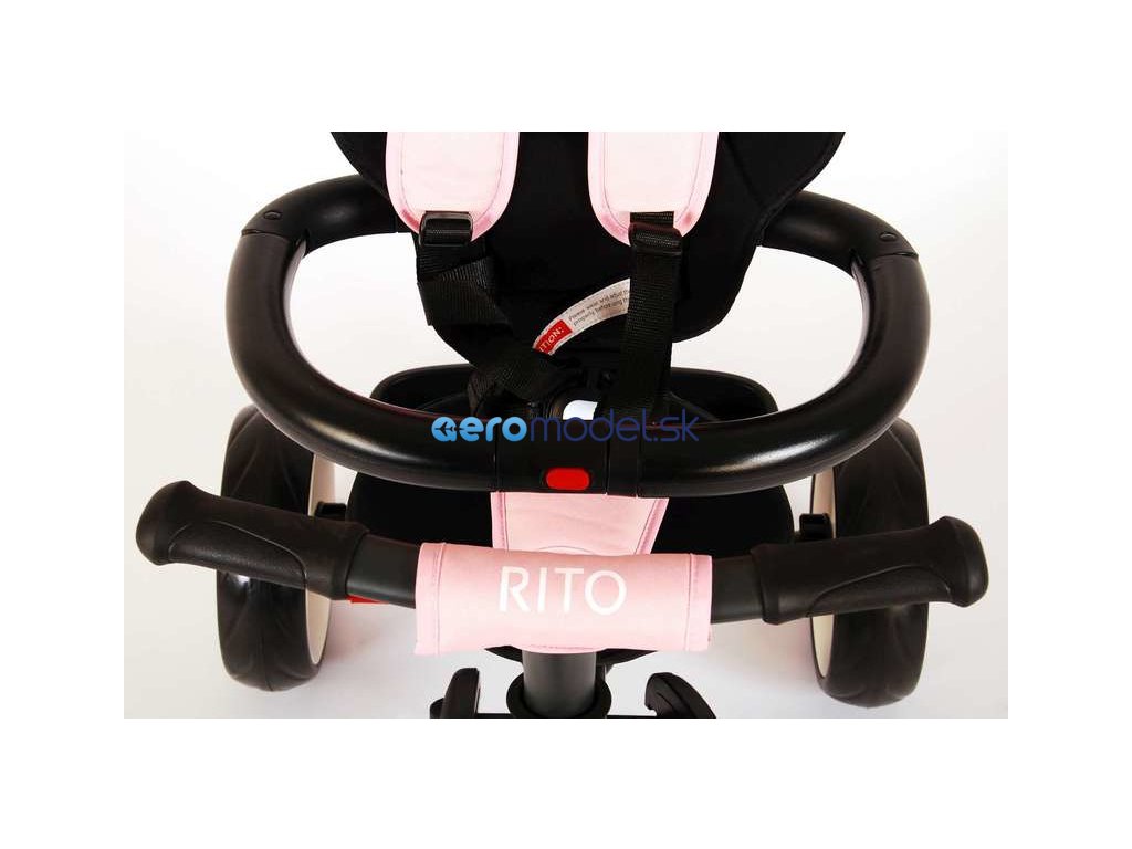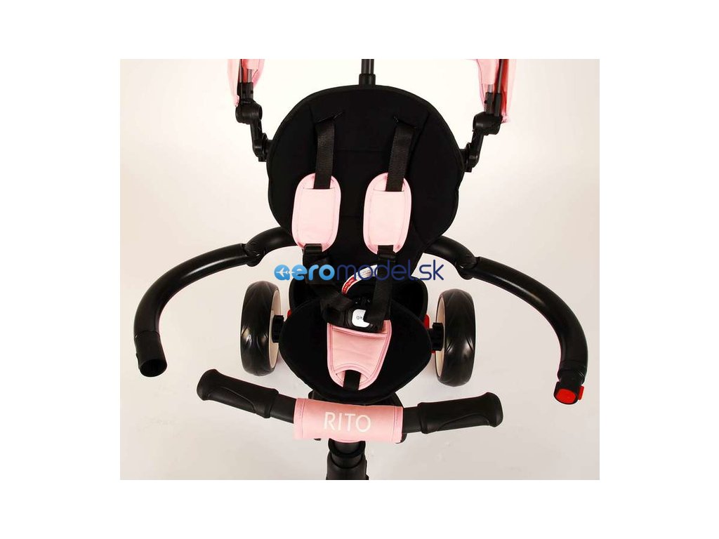 Luxusní dětská tříkolka Volare - Rito Deluxe. Bezpečný 5-bodový pás. Sklopná stříška proti UV záření. Rodičovské madlo pro vedení dítěte. Stupačka a aretace šlapátek. Nastavitelná zádová opěrka. Lze demontovat opěrku a použít jako klasickou tříkolku. Vhodné pro děti od 10 měsíců do 3 let.