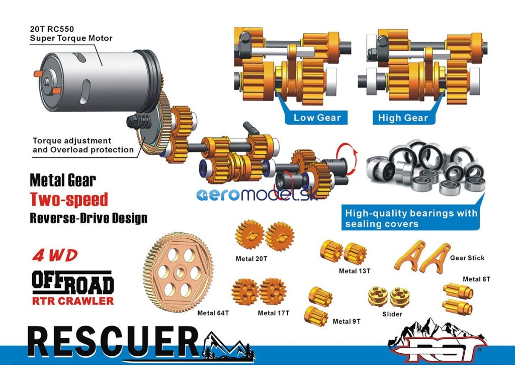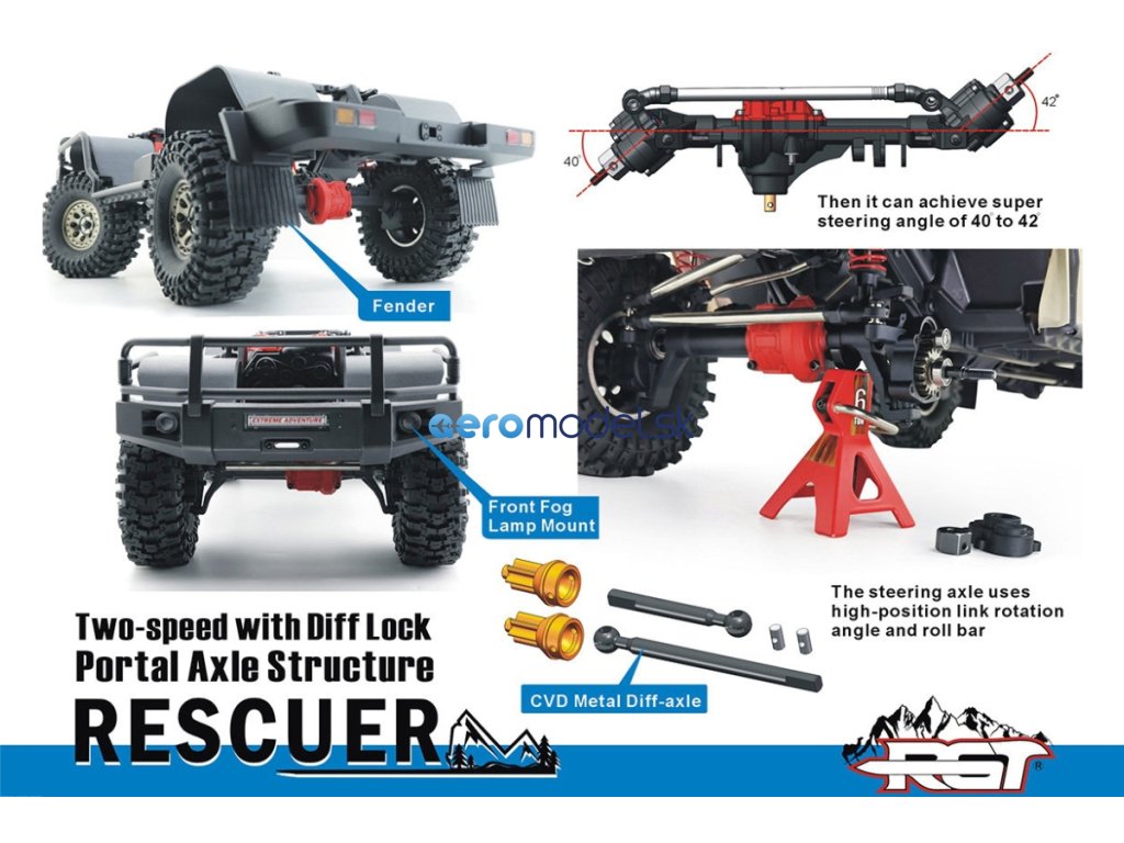 Rescuer má pevný rám podvozku, rozvor 324mm, 2rychlostní převodovku s reverzní rotací, maximální úhel zatáčení 42 stupňů, portálové nápravy s uzamykatelnými diferenciály, kovové převody, nastavitelné kovové "piggyback" tlumiče s dvojími pružinami, kvalitní utěsněná ložiska, nebo kovové CVD poloosy.