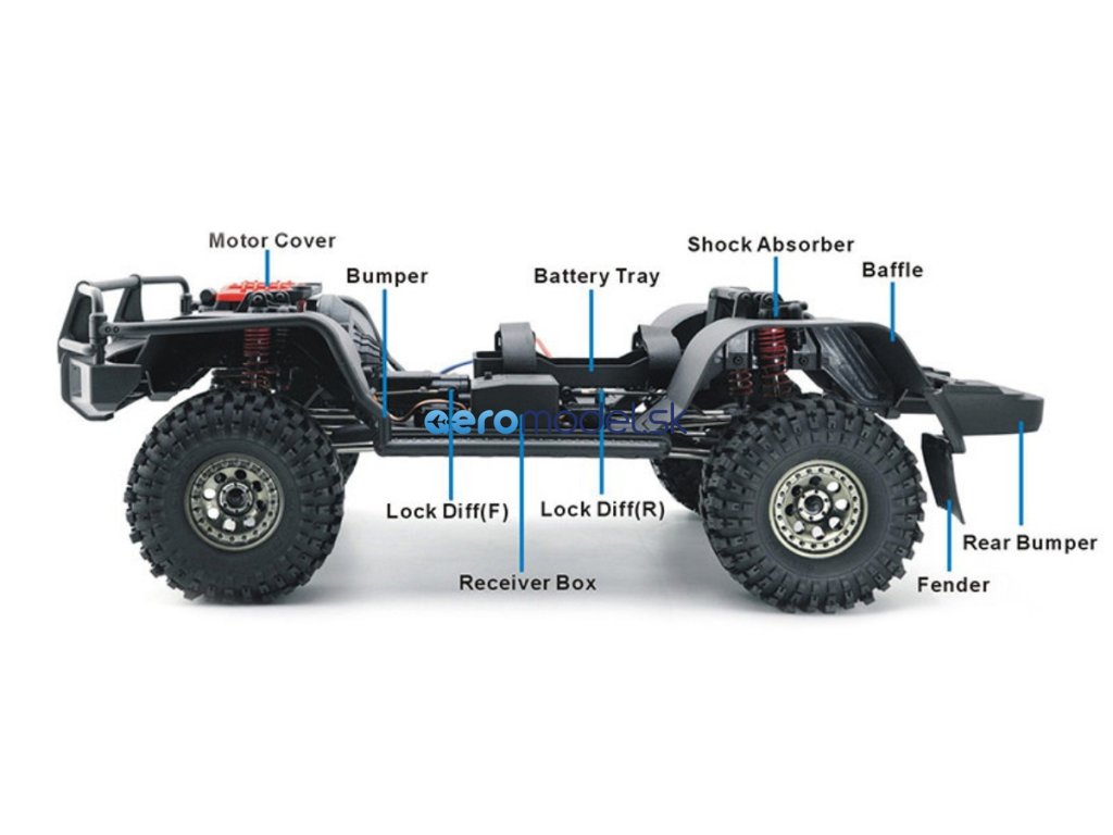 - 2,4GHz 6kanálové rádio s tlačítky pro ovládání serva převodovky, 2 serv pro ovládání uzávěr diferenciálů a LED světelný modul.