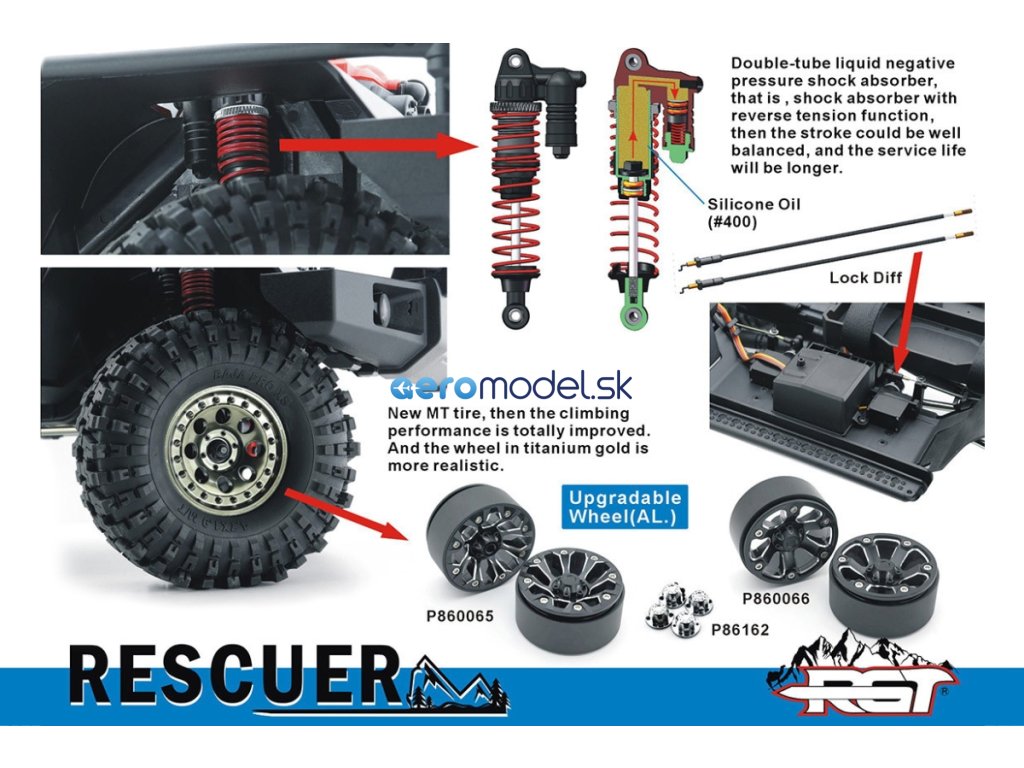 Rescuer má pevný rám podvozku, rozvor 324mm, 2rychlostní převodovku s reverzní rotací, maximální úhel zatáčení 42 stupňů, portálové nápravy s uzamykatelnými diferenciály, kovové převody, nastavitelné kovové "piggyback" tlumiče s dvojími pružinami, kvalitní utěsněná ložiska, nebo kovové CVD poloosy.