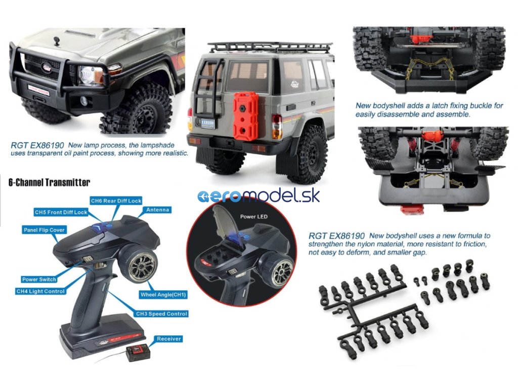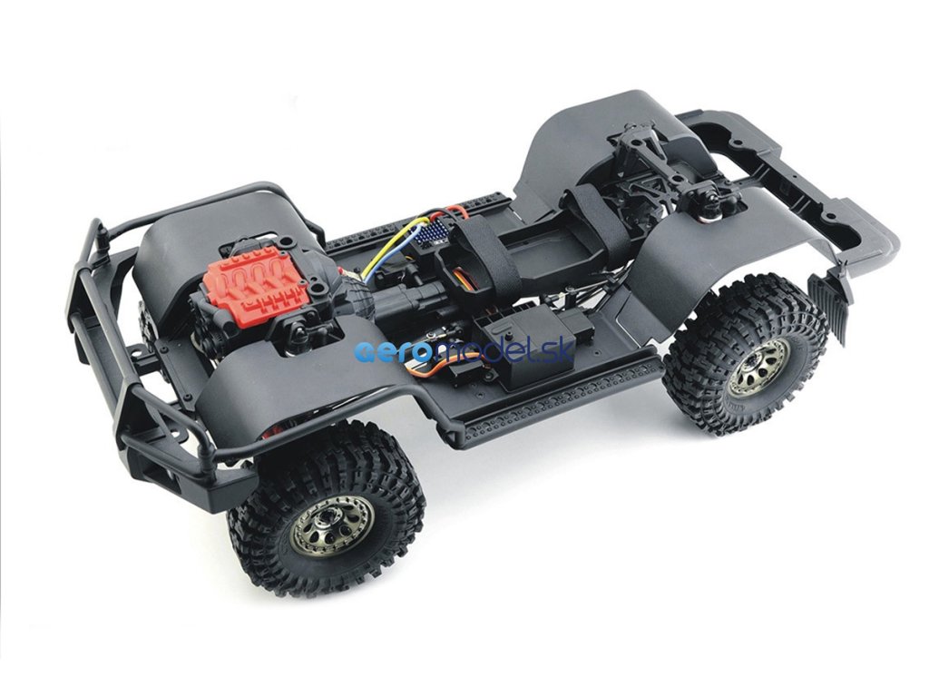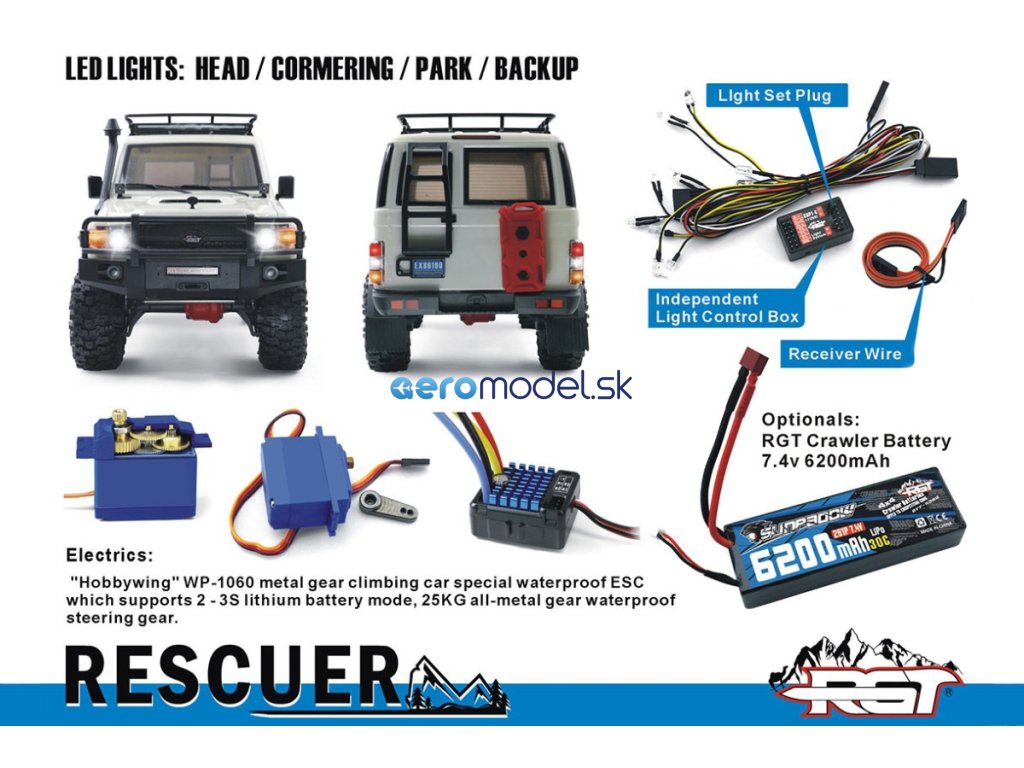 - 2,4GHz 6kanálové rádio s tlačítky pro ovládání serva převodovky, 2 serv pro ovládání uzávěr diferenciálů a LED světelný modul.