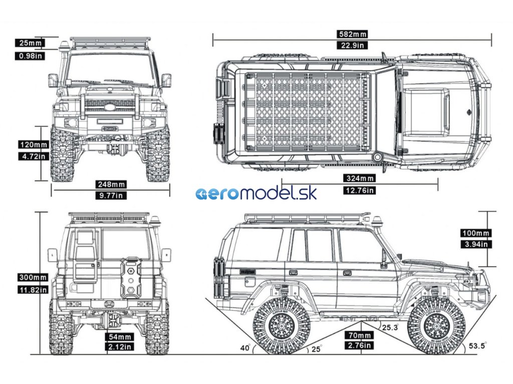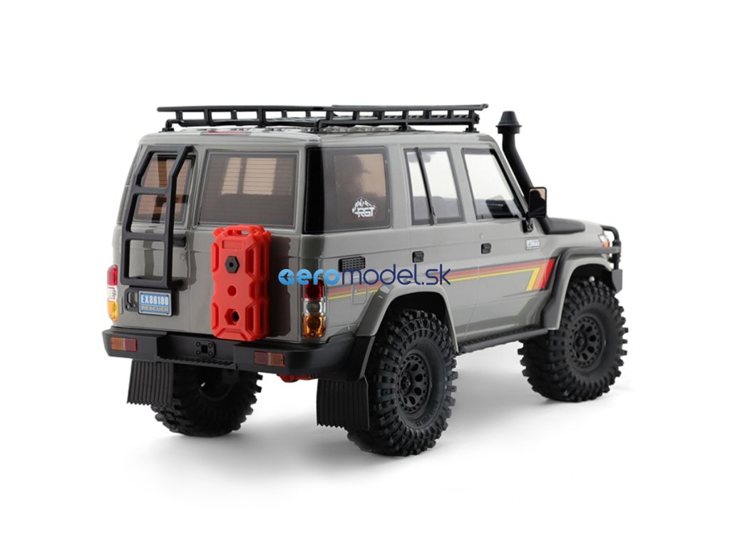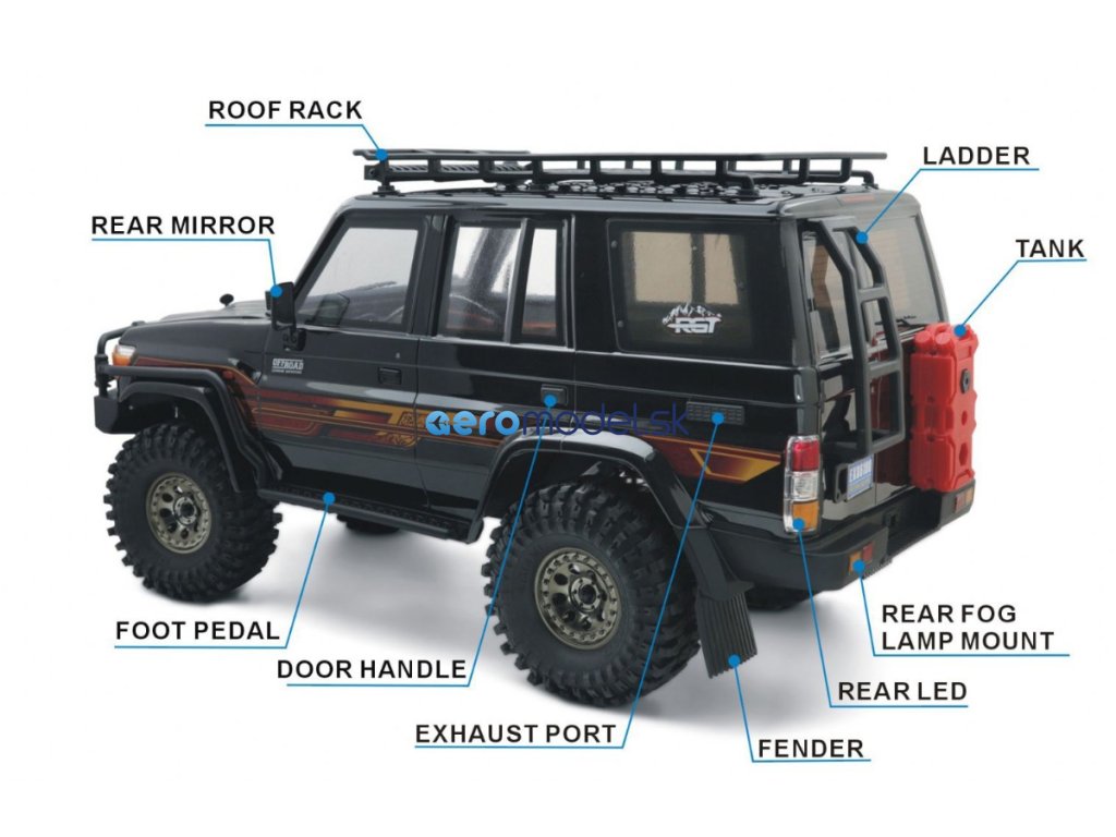 1,5mm lexanová karoserie má průhledná okna, otevíratelnou kapotu skrývající kryt motoru V8 vpředu, dedikovaný LED světelný modul a řadu doplňků, jako je střešní zahrádka, přídavná světla, šnorchl, zpětná zrcátka, kliky dveří, žebřík, nádrž a další.