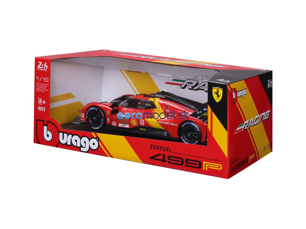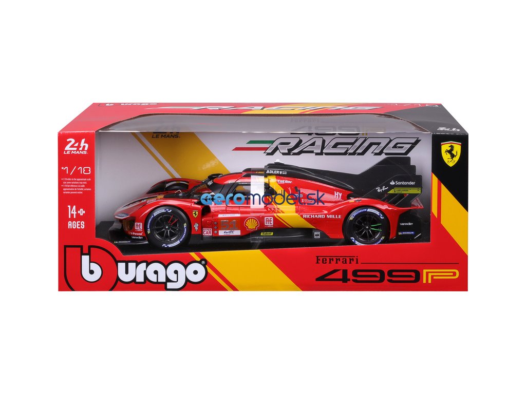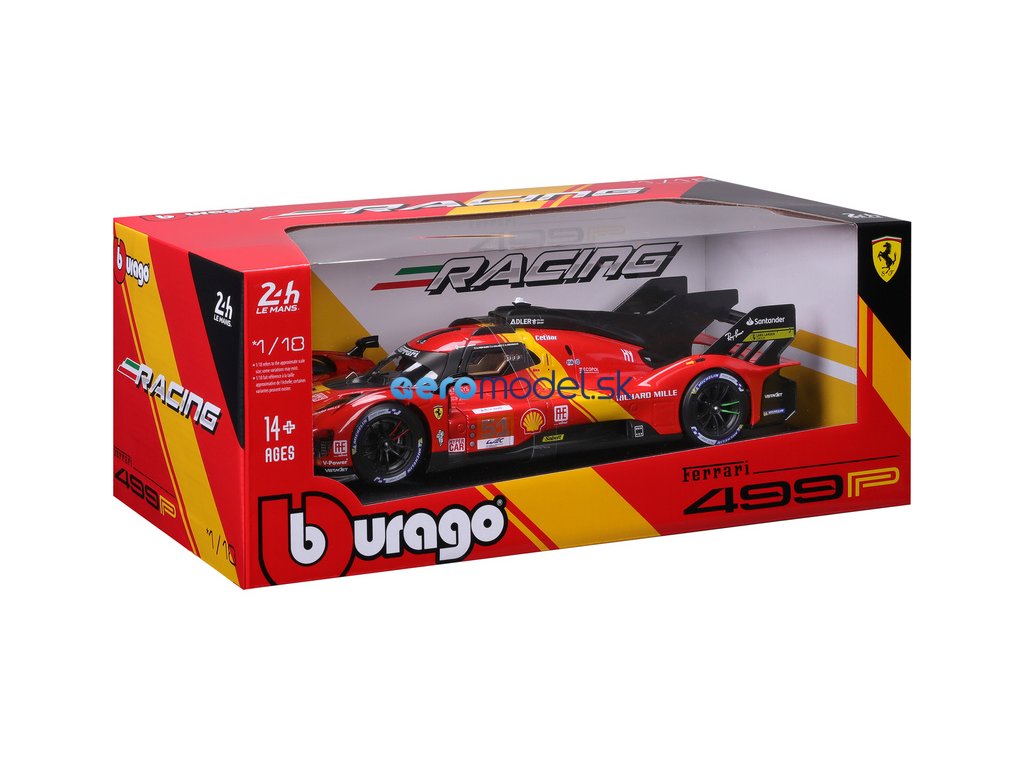 Kovový model auta Ferrari Racing 499P v měřítku 1:18 nejen pro sběratele od Bburaga. Detailní provedení, přívětivá cena, barva #51, délka přibližně 24 cm.