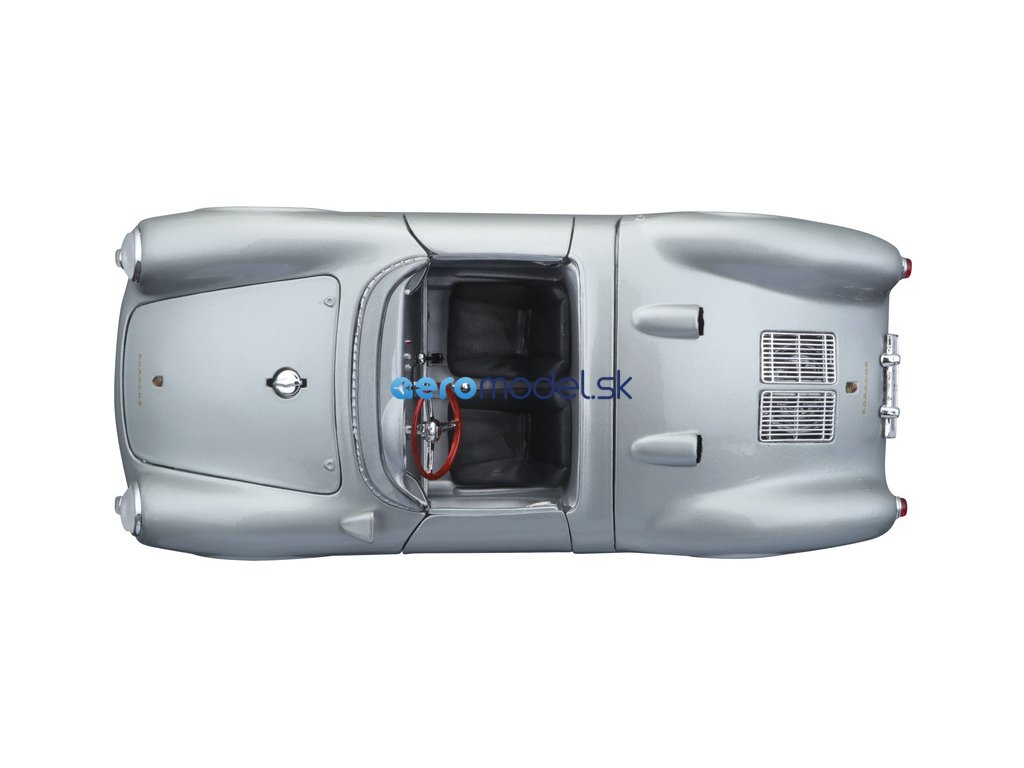 Kovový model auta 1:18 Maisto 31843 Porsche 550 A Spyder nejen pro sběratele. Model je v detailním provedení na plastovém podstavci. Barva modelu je stříbrná.