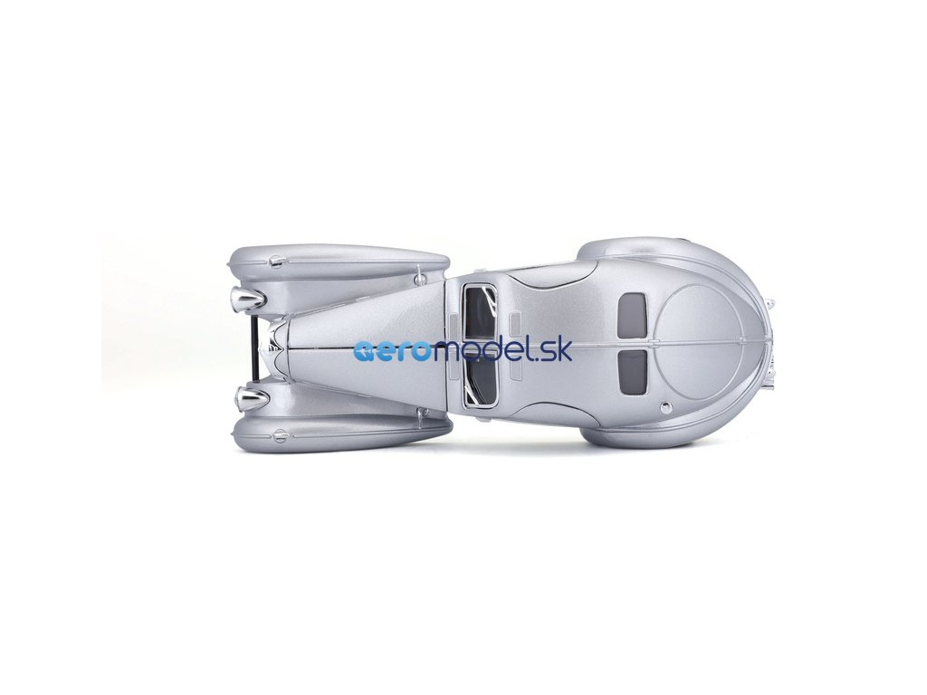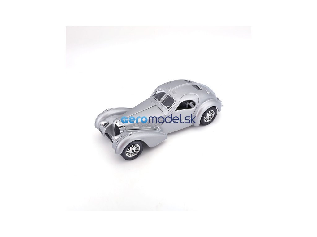 Kovový model auta 1:24 Bburago 18-22092 Bugatti Atlantic nejen pro sběratele. Má otevírací dveře a kapotu, natáčení kol volantem je plně funkční. Barva modelu je stříbrná.
