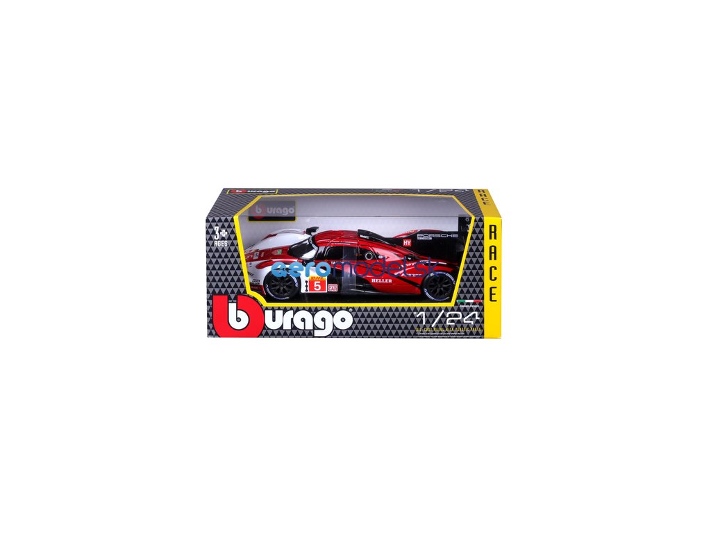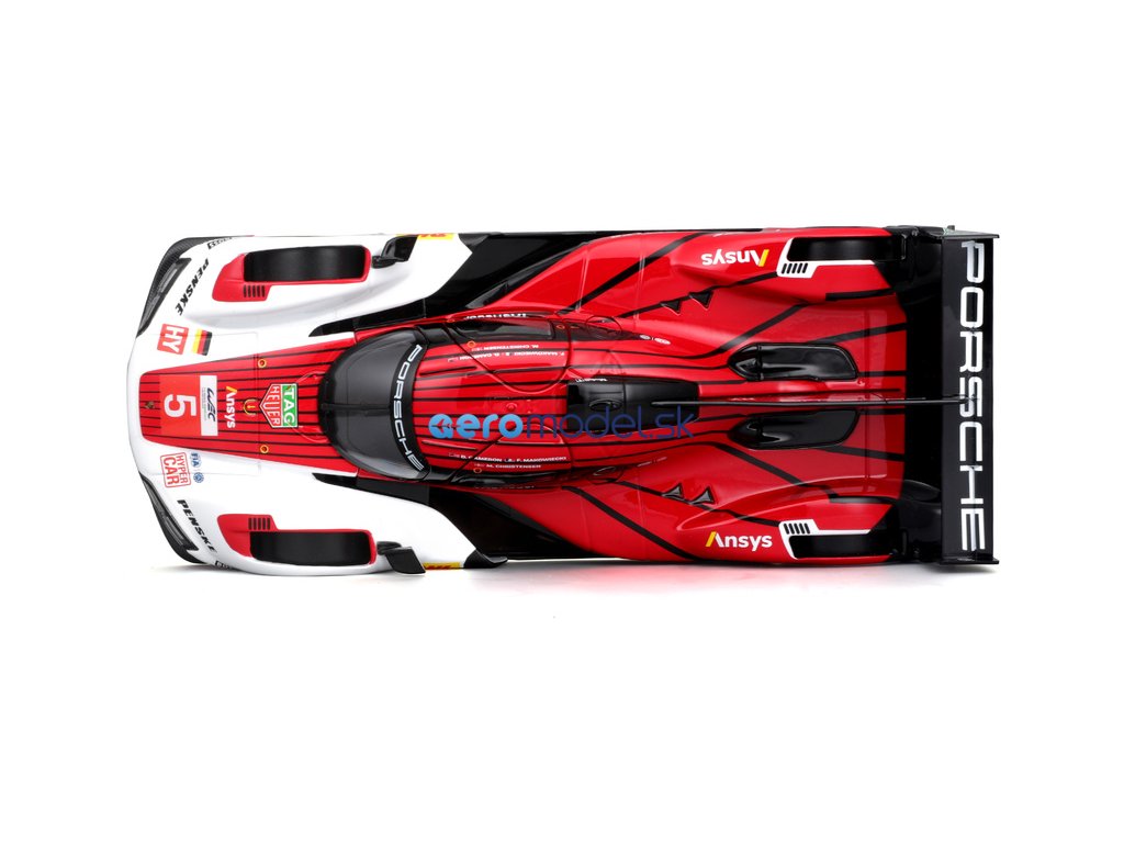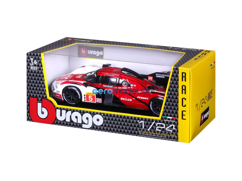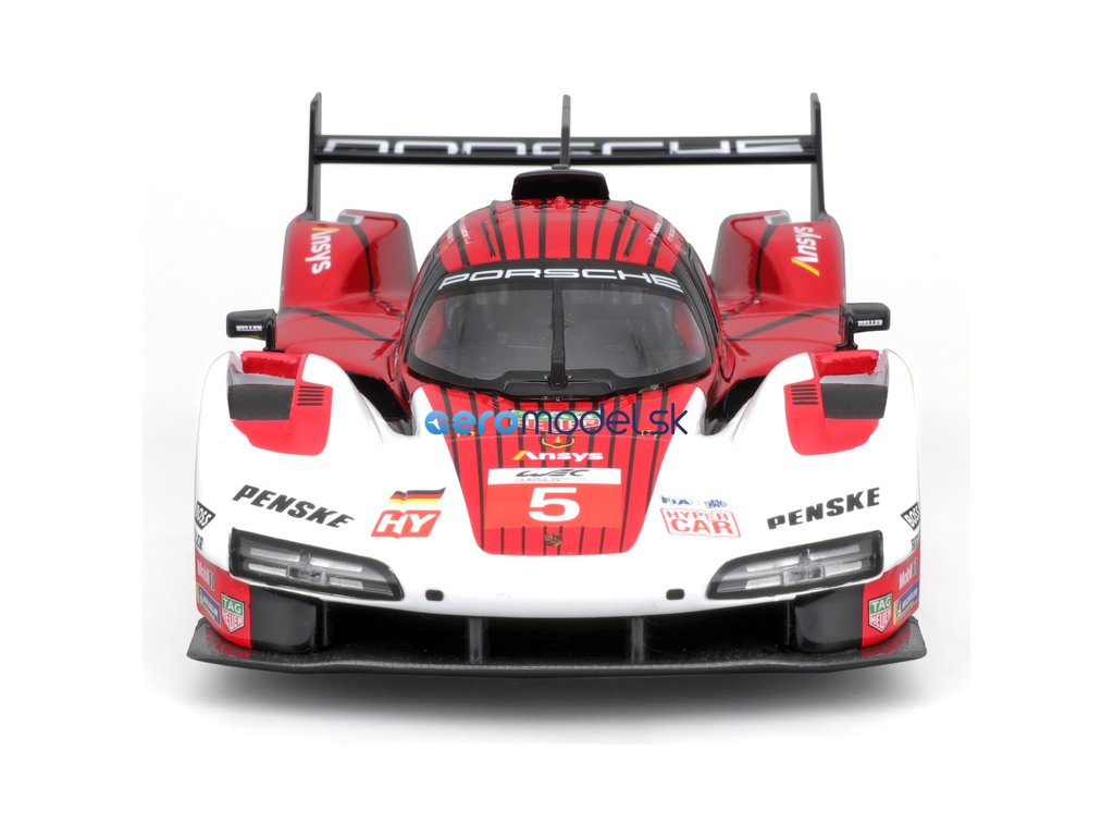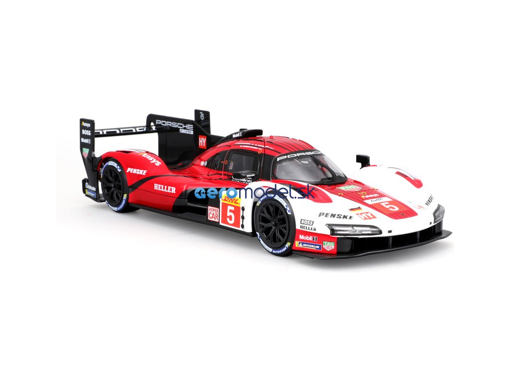 Kovový model auta 1:24 Bburago 18-28022 Porsche 963 nejen pro sběratele. Má otevírací dveře, barva modelu je #5 a je přibližně 19 cm velký.