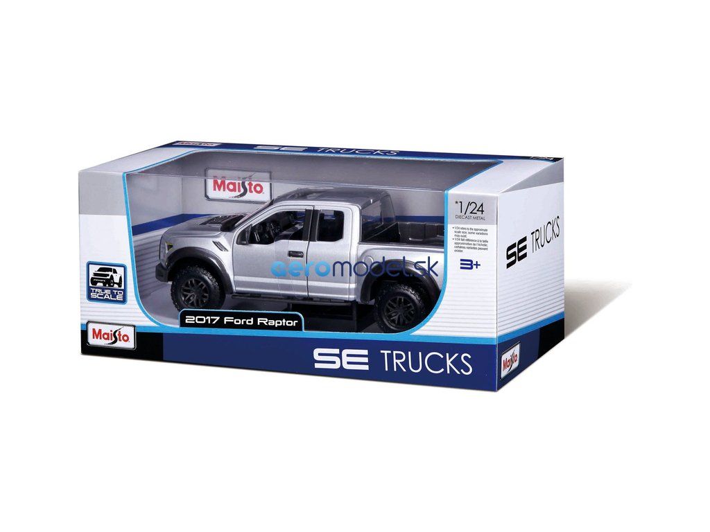 Kovový model auta 1:24 Maisto 31266GY Ford F-150 Raptor 2017 nejen pro sběratele. Model je v detailním provedení a má otevíratelné dveře. Barva modelu je šedá a je přibližně 17 cm velký.