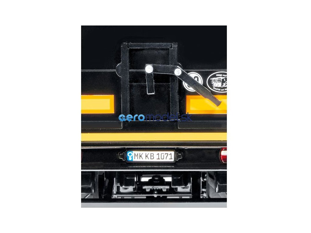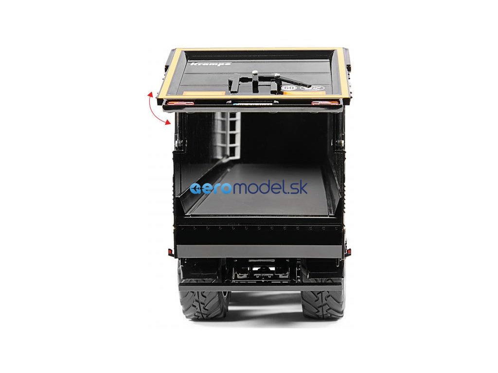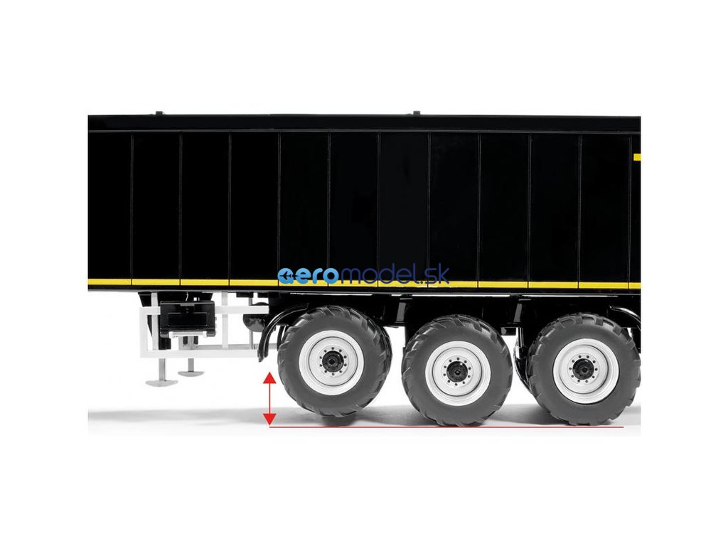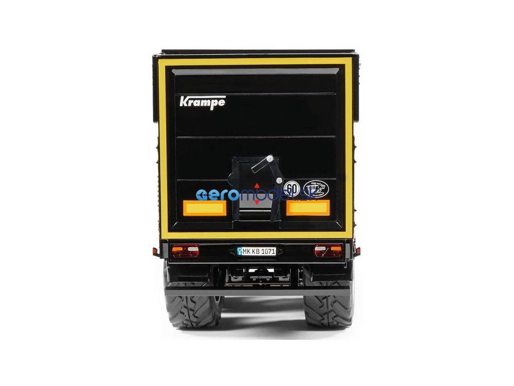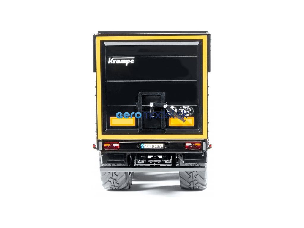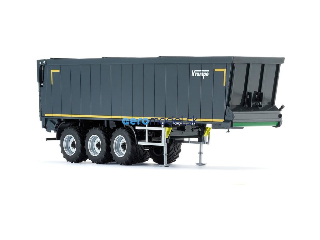 Třínápravový návěs Krampe SB II 30/1070 - šedý, v měřítku 1:32. - příslušenství pro kovové modely tahačů Wiking 1:32. Obsahuje funkční odpružení kol se zatáčecí zadní nápravou, zdvihací nápravu, otevírací čelo s otvorem pro jemné dávkování, výsuvné stojky, gumová kola a klíny kol. Na levé straně je otevírací schránka pro nářadí. Kvalitní zpracování z kovu a plastu.