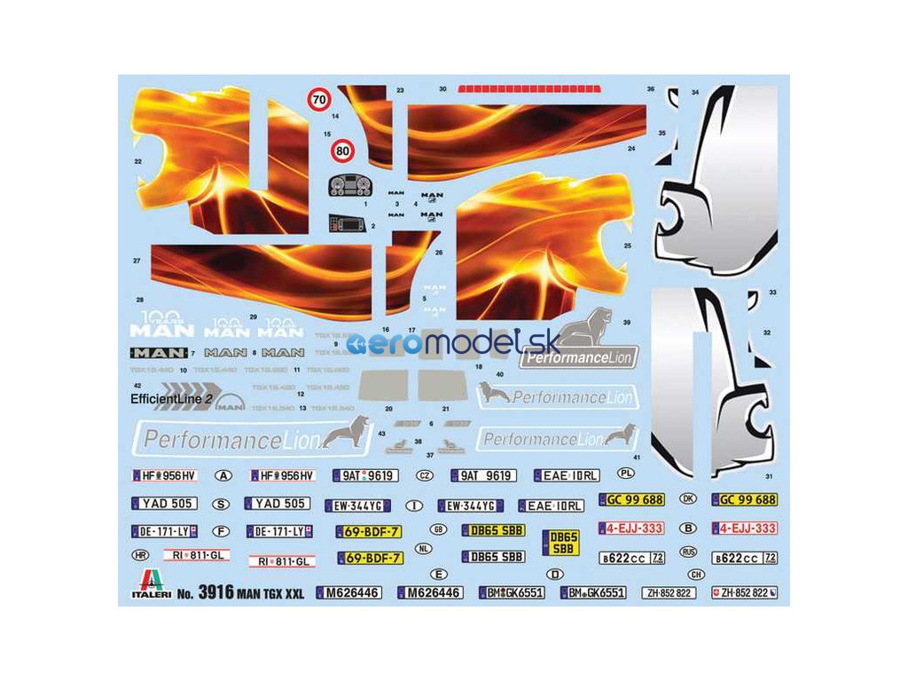 Plastikový model Italeri 3916 - nákladné auto MAN TGX XXL D38 v mierke 1:24 na zlepenie. Dĺžka modelu 257 mm, obtiažnosť 4.