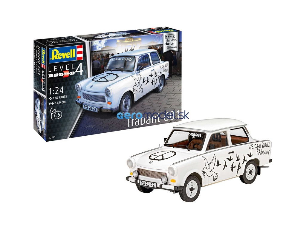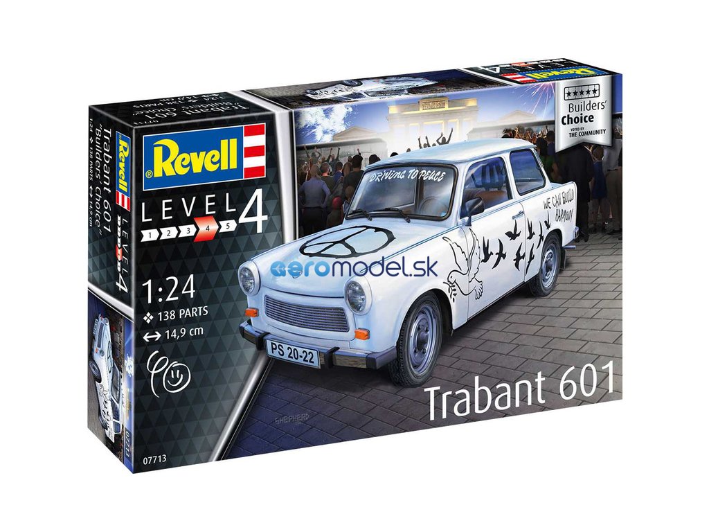 Plastikový model Revell 07713 - auto Trabant 601S v mierke 1:24 na zlepenie. Stavebnica obsahuje 138 dielov, dĺžka 149 mm, obtiažnosť 4. Od komunity pre komunitu - to sú stavebnice "Revell Builder's Choice". Tentoraz je to Builder's Choice s kúskom východonemeckej histórie.