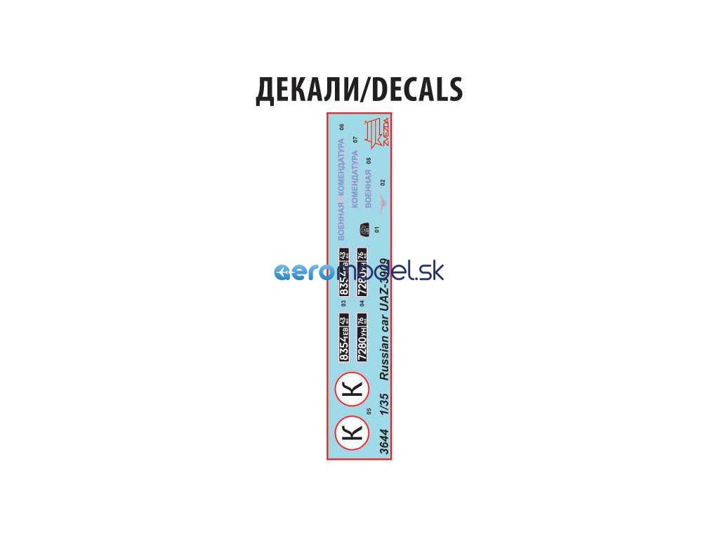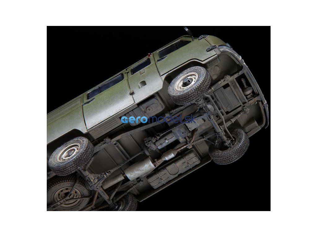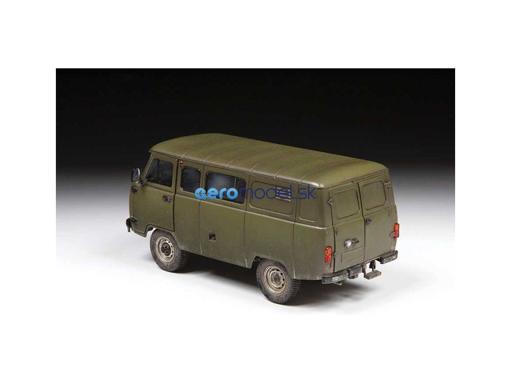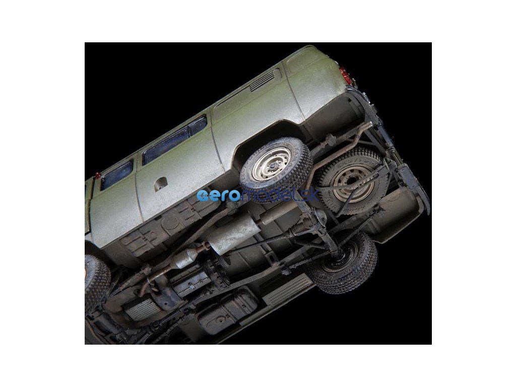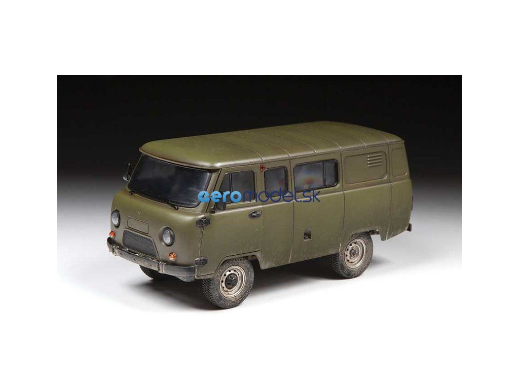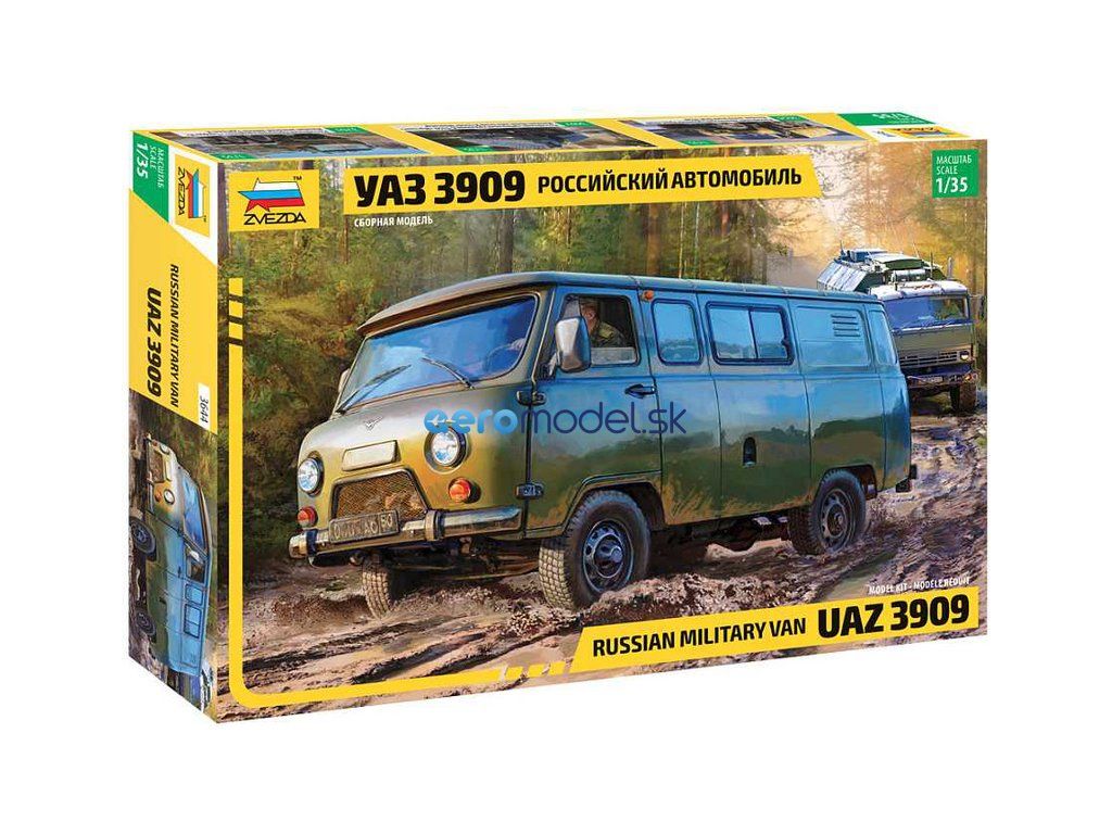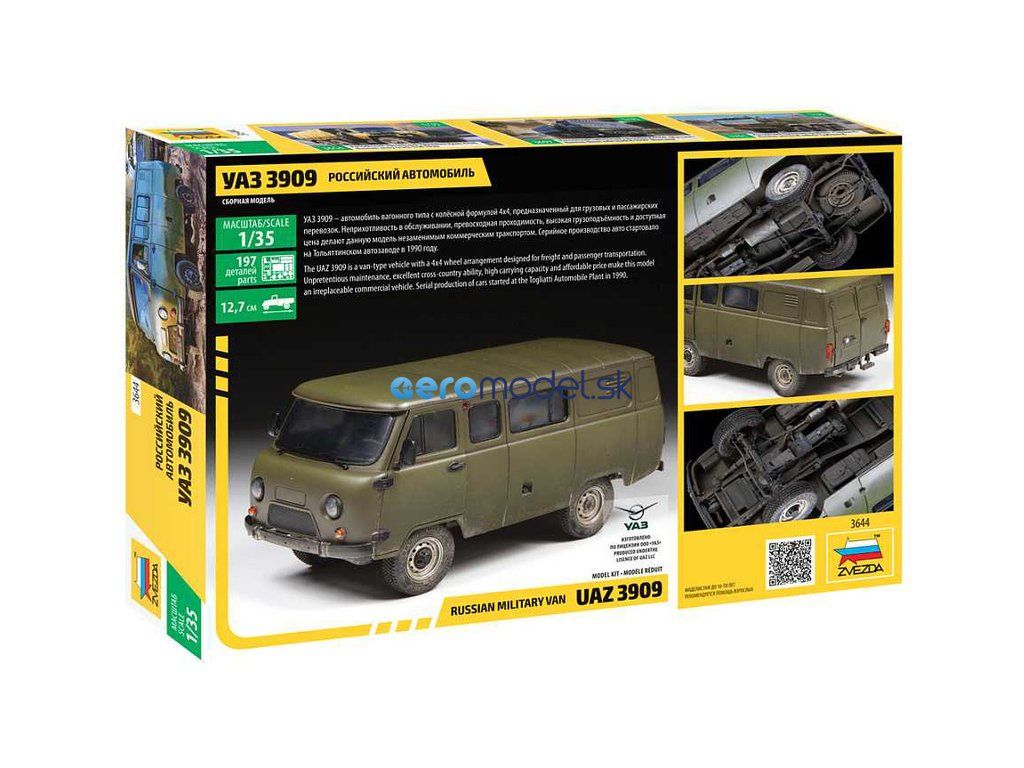 Plastikový model Zvezda 3644 - vojenský UAZ 3909 v mierke 1:35 na zlepenie. Stavebnica obsahuje 197 dielikov, dĺžka 127 mm.