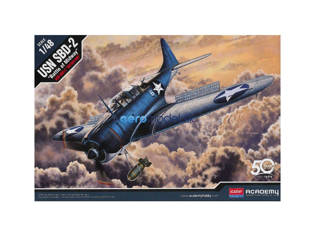 Plastikový model lietadla Douglas SBD-2 USN Midway v mierke 1:48 od Academy.
