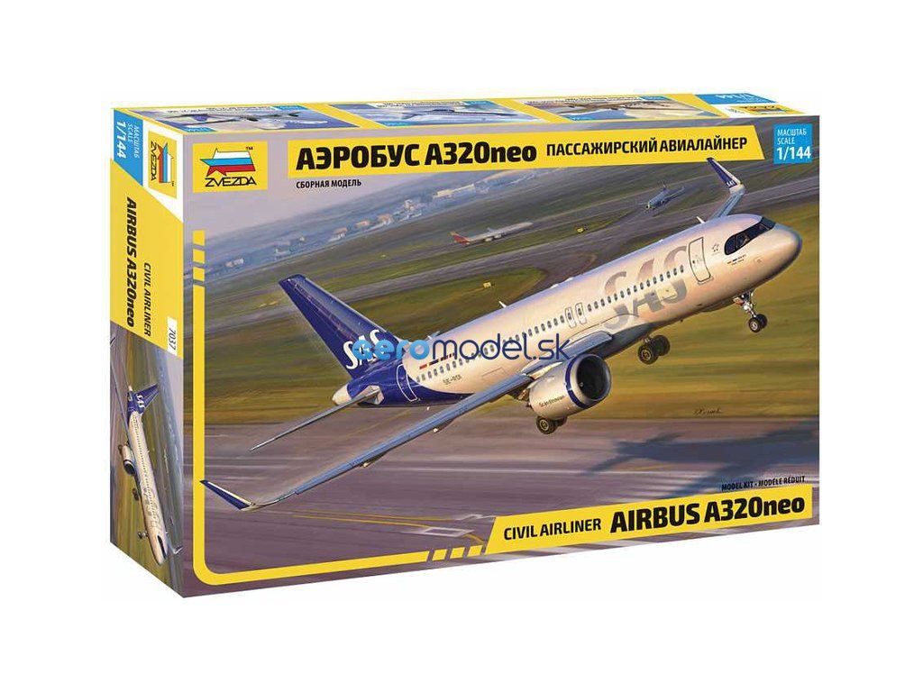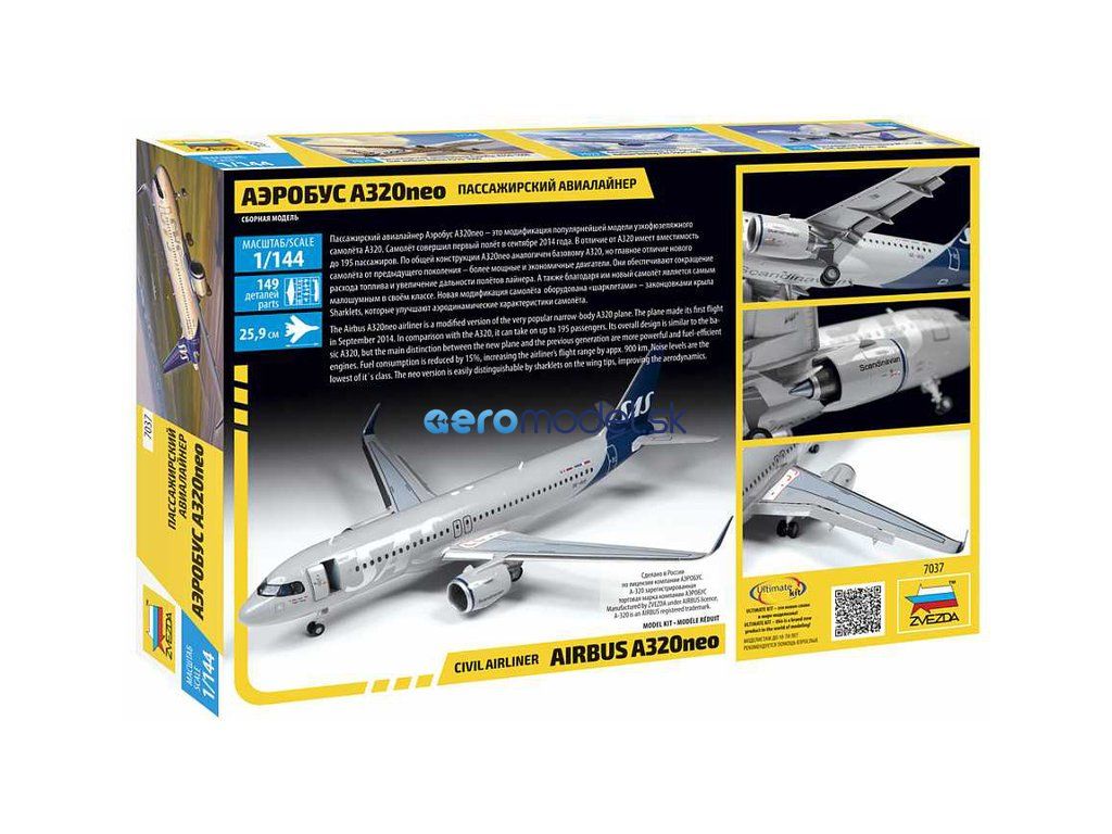 Plastikový model Zvezda 7037 - dopravné lietadlo Airbus A320neo v mierke 1:144 na zlepenie. Stavebnica obsahuje 149 dielov, dĺžka 259 mm, obtiažnosť 3.