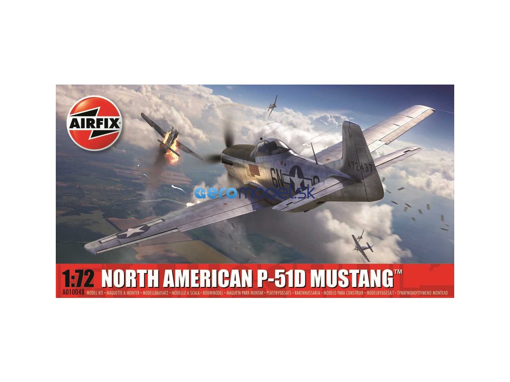 Plastikový model Airfix A01004B - letadlo North American P-51D Mustang v měřítku 1:72 ke slepení. Stavebnice obsahuje 53 dílků, rozpětí křídel 157 mm, obtížnost 1.