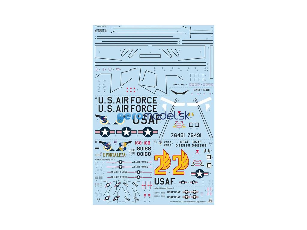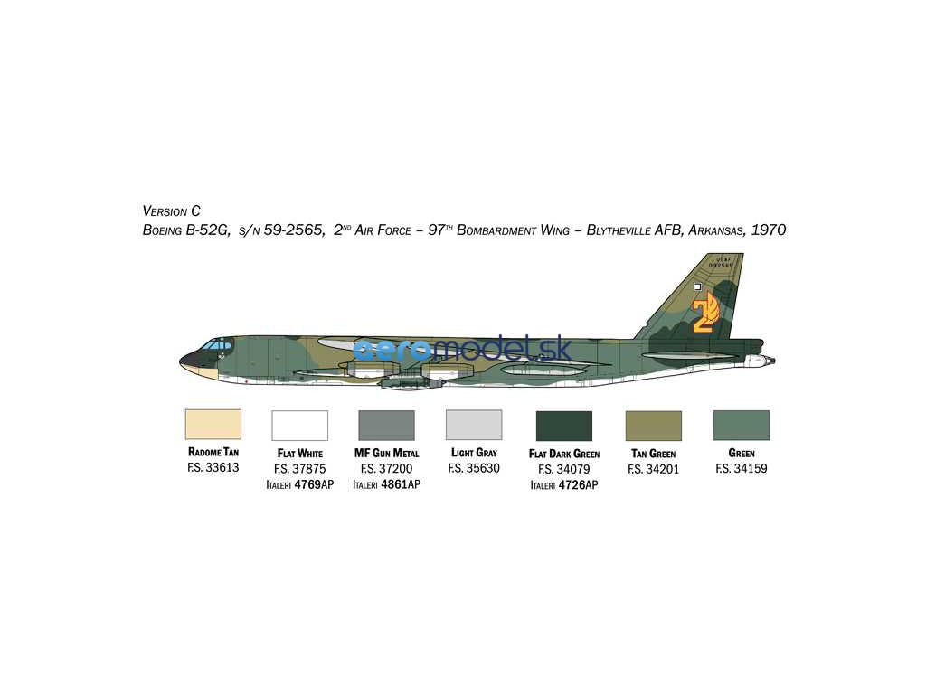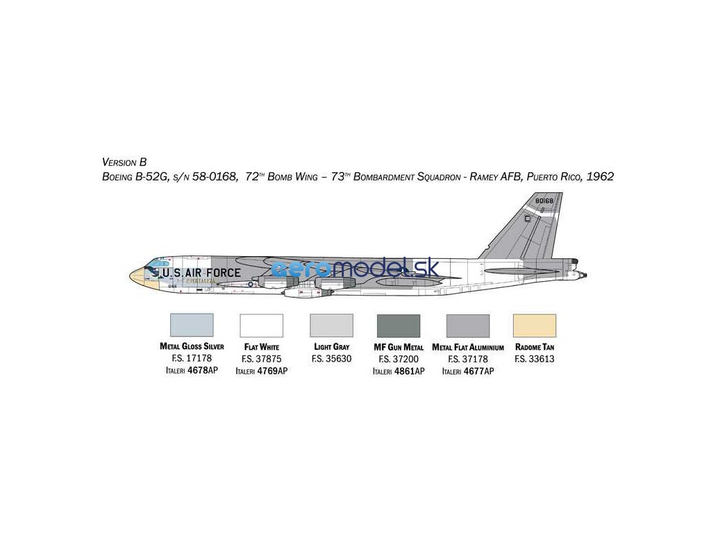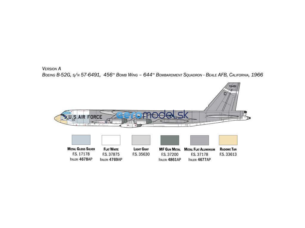 Plastikový model Italeri 1451 - Boeing B-52G Stratofortress Early version v mierke 1:72 na zlepenie. Dĺžka modelu 680 mm, obtiažnosť 4. Balenie obsahuje skvelé obtlačky pre 3 verzie.